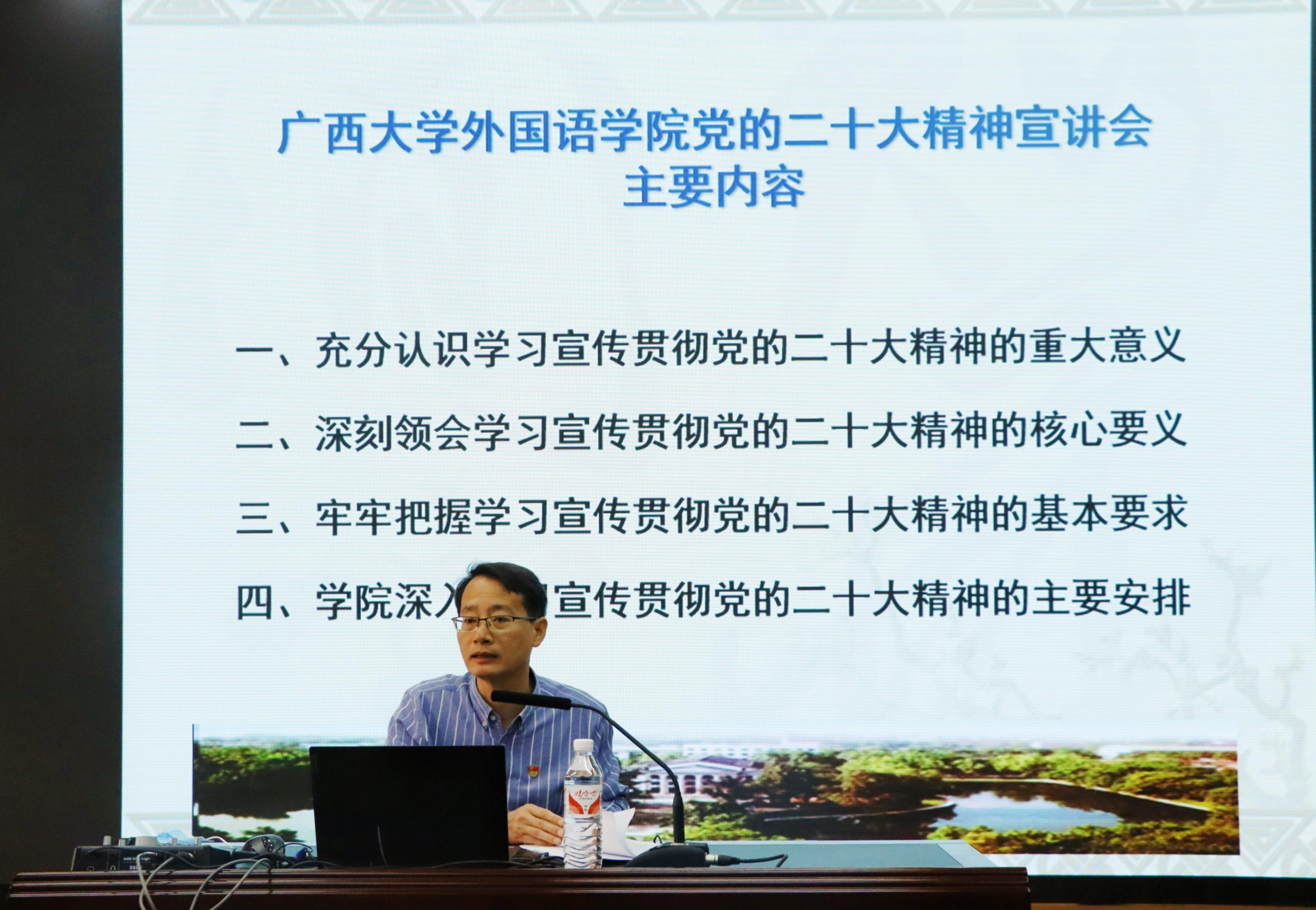 黄书记向学员们提出要牢牢把握学习宣传贯彻党的二十大精神的基本要求,并介绍了学院深入学习和宣传贯彻党的二十大精神的主要安排。结合习近平总书记参加广西代表团讨论做出的指示,黄书记强调,要坚持学思用贯通,知信行统一,积极培养大学生成为德智体美劳全面发展的社会主义建设者和接班人,并鼓励同学们“只要坚持奋斗,持续奋斗,我们就能创造美好未来!”