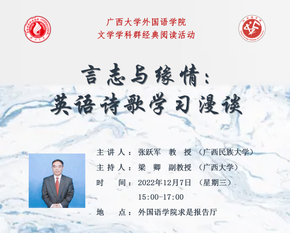 12月7日下午,英国上市公司365文学学科群经典阅读活动“言志与缘情:英语诗歌学习漫谈”于英国上市公司365求是报告厅顺利举行。此次经典阅读活动由张跃军教授主讲,梁卿副教授主持,吸引了学院众多师生到场交流学习。