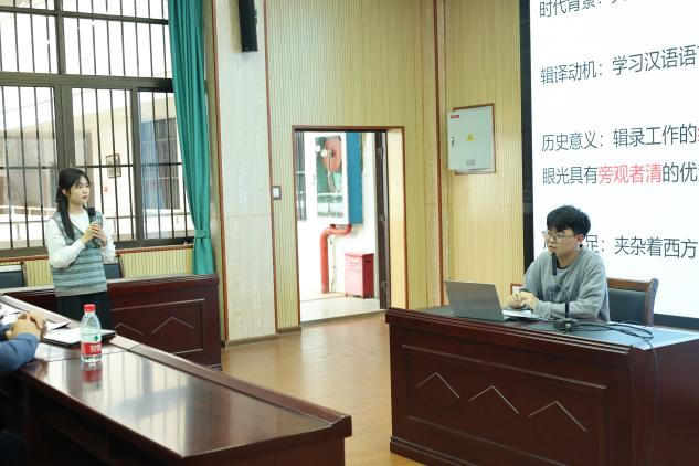 周洋舟同学作为本次沙龙活动第一位主讲人,以《19世纪英语书刊辑译汉语熟语述略》为题,全面阐述了研究背景与意义、熟语辑译形式,以及19世纪熟语辑译工作的主要特征,并在报告结尾详细介绍了该领域深入研究的方向。周洋舟同学的报告内容丰富、研究工作扎实,在讲解过程中他逻辑清晰,步步深入,从英语书刊辑译汉语熟语研究的角度为同学们提供了新的思路。
