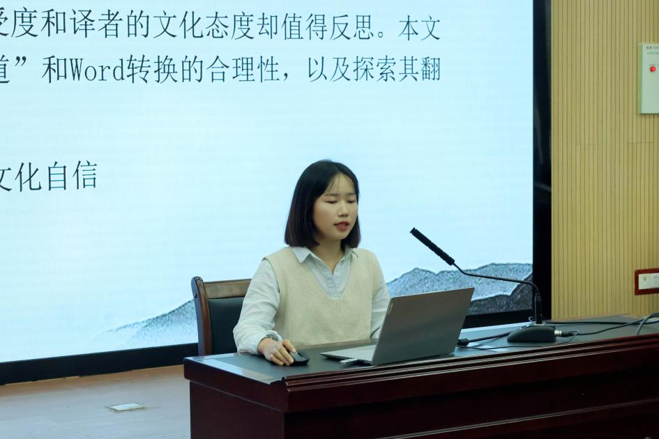 刘蓓丽同学的学术报告题为《论赵彦春英译〈道德经〉中“道”的翻译》。在报告中,刘蓓丽同学详细介绍了“道”的英译法变化,指出“Tao”这一英译法已有广泛的接受度,并对“道”与“Word”转换的合理性进行解析。刘蓓丽同学的报告深入浅出地阐述了典籍翻译策略与文化自信之间的内在关联,所选研究课题与时代背景紧密相关,具有丰富的文化内涵和现实意义。