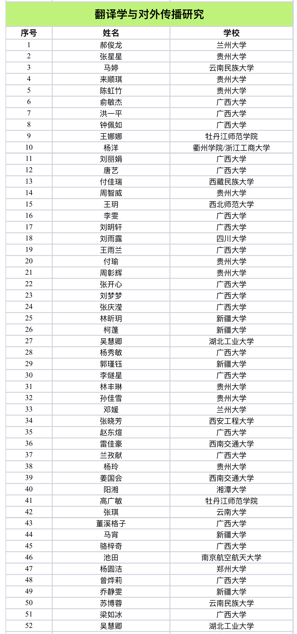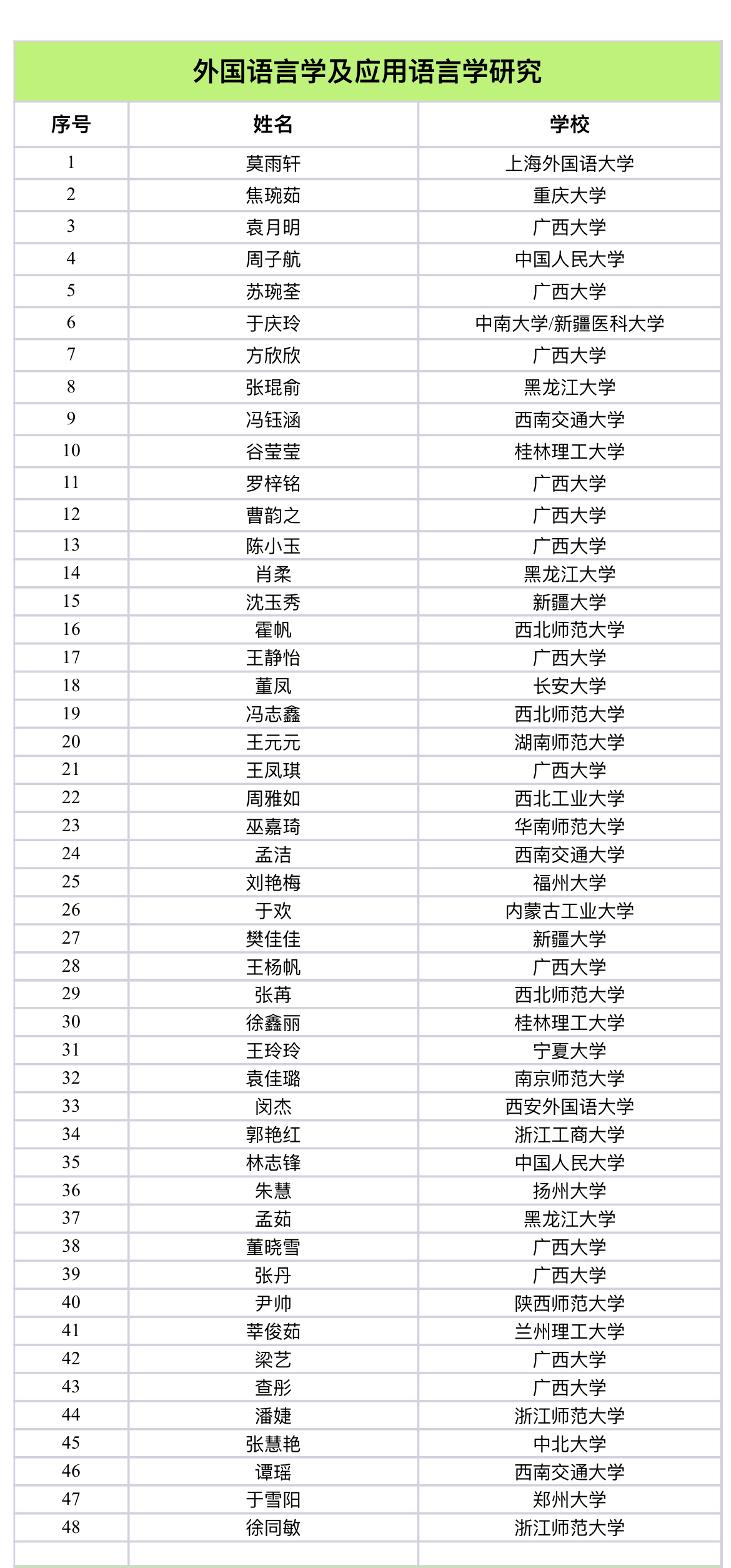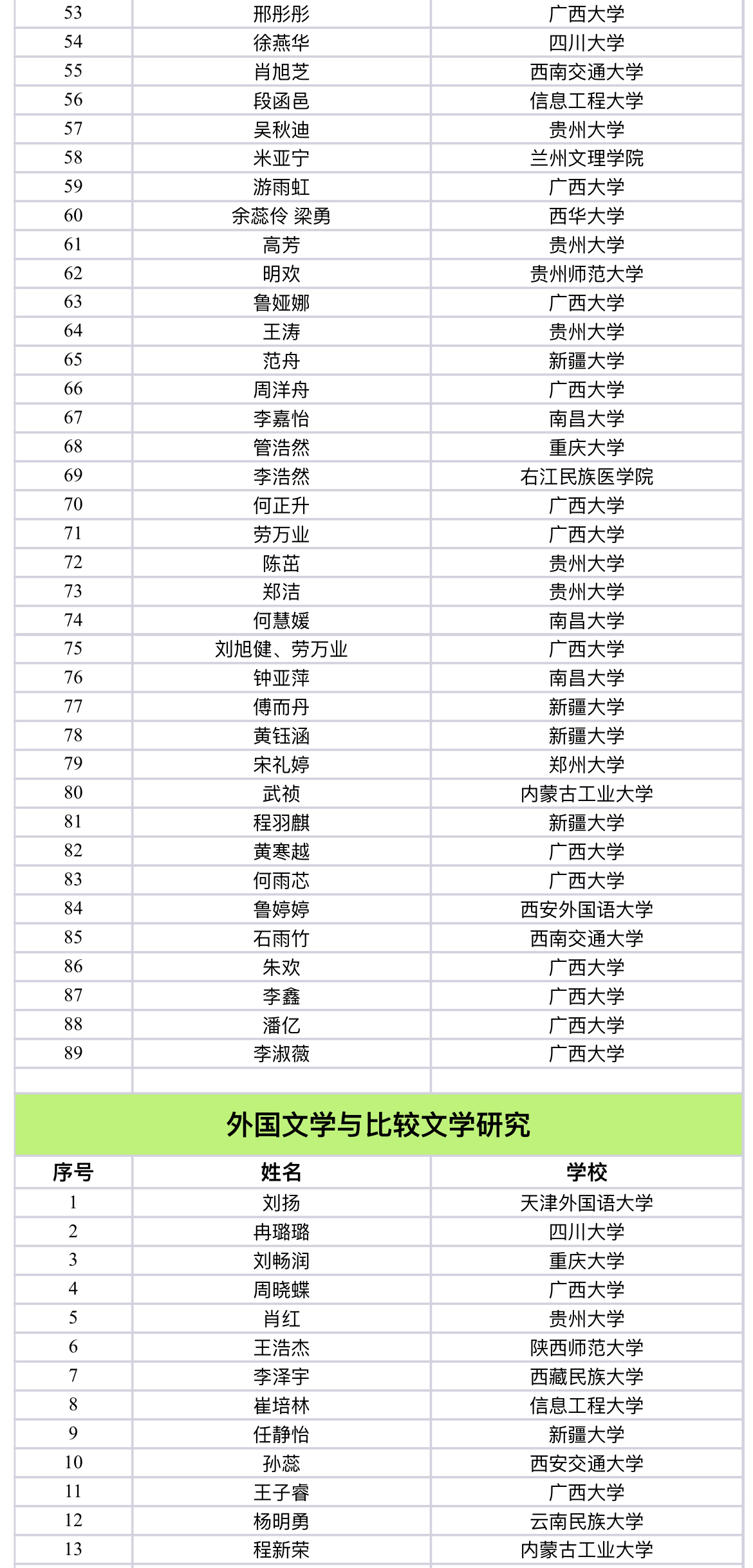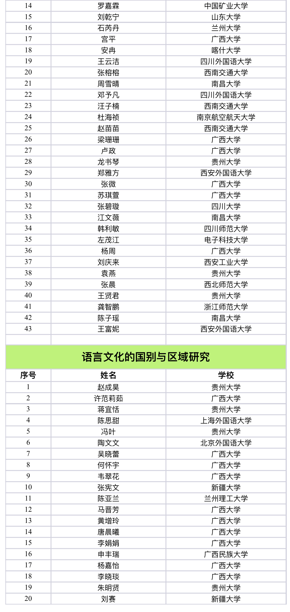 自一号、二号通知公布以来,全国首届西部与边疆地区外语研究生学术论坛共收到来自四川大学、中国人民大学、山东大学、北京外国语大学、上海外国语大学等70余所高校、250余名研究生的踊跃投稿和全国80余名研究生的旁听申请。经过论坛组委会专家严格的双盲审评阅及论文查重筛选(复制比须低于25%),确定最终进入分论坛宣读的研究生论文200篇。现将名单公示如下: