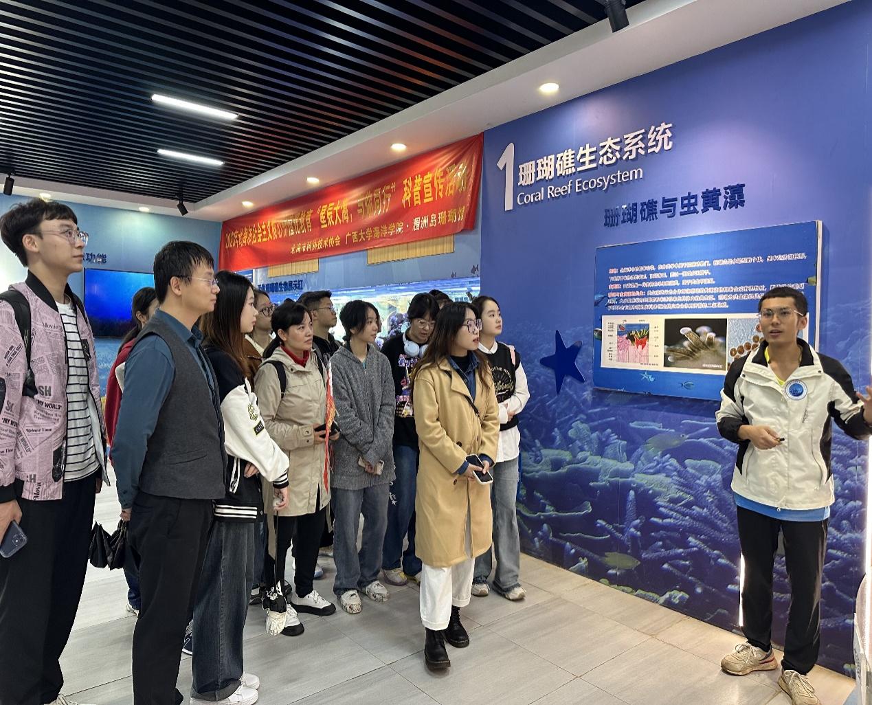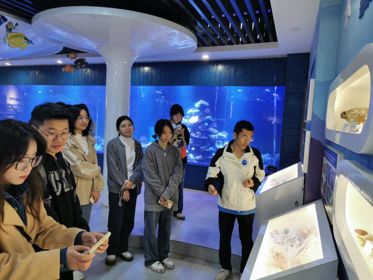 (珊瑚馆研究员李雨潇老师向实习团队讲解珊瑚礁生态系统)