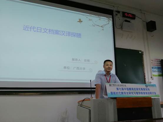 此次会议设立了8个平行论坛,彭程教授在主题为“其他翻译史问题研究(一)”的第七组中,做了题为“论近代日文档案汉译探赜”的报告。主要就近代日文档案中汉译是翻译策略进行了论述。此外,彭程教授作为第七组的点评专家,对该组其他几个报告进行了逐一点评。