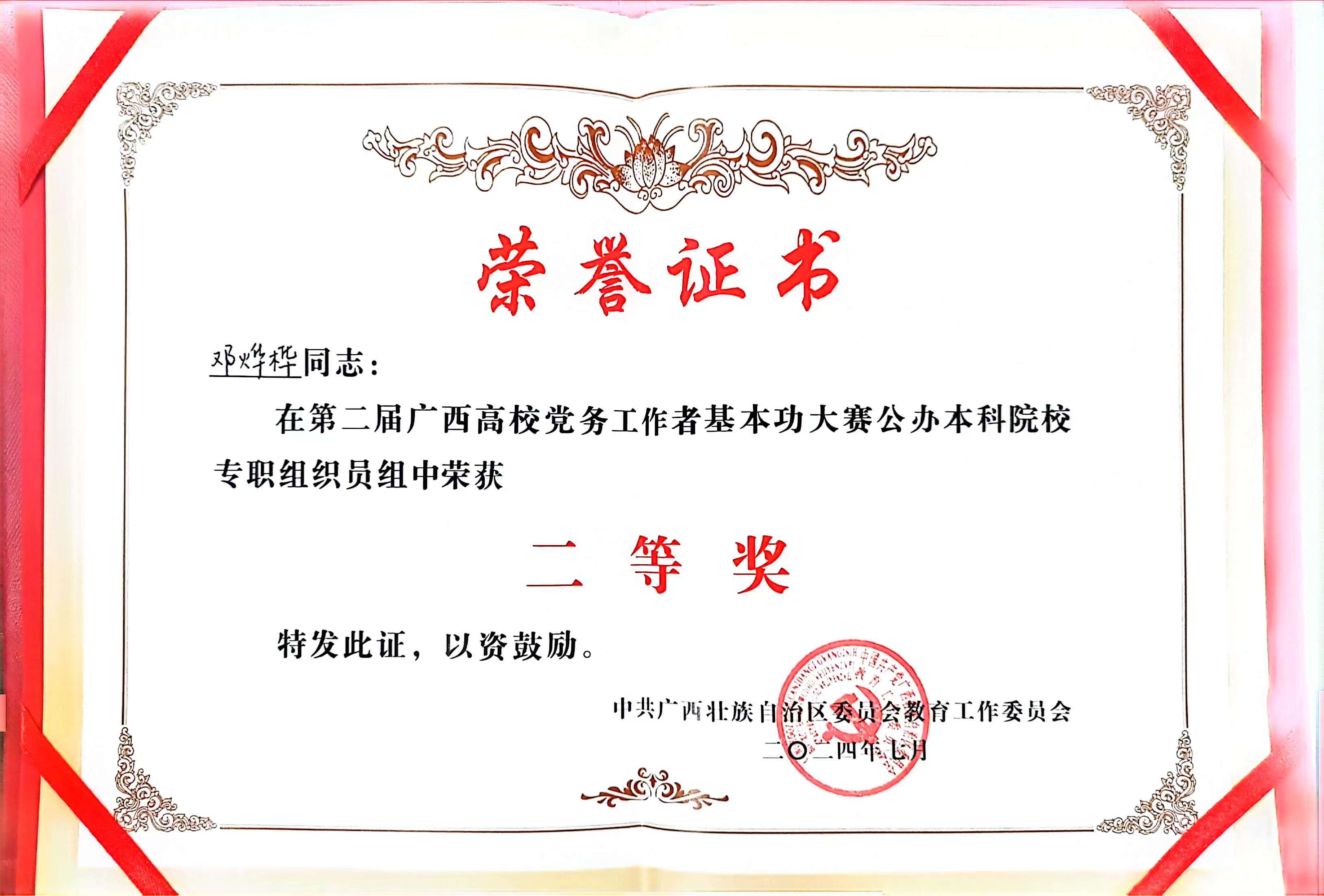 7月10日,第二届广西高校党务工作者基本功大赛在桂林理工大学圆满落下帷幕。我院邓烨桦老师代表广西大学参加专职组织员组比赛,经过激烈角逐,荣获二等奖。