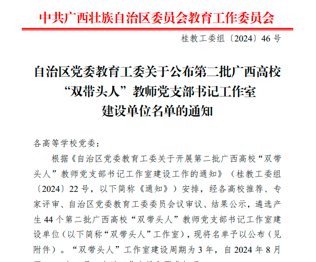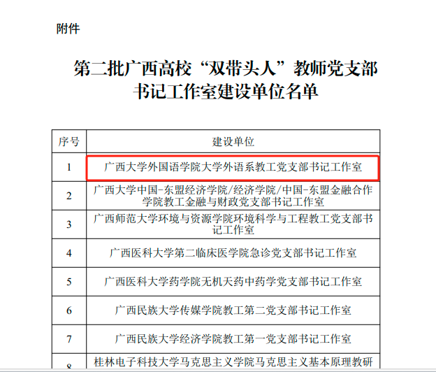 近日,中共广西壮族自治区委员会教育工作委员会公布了第二批广西高校“双带头人”教师党支部书记工作室建设单位名单,我院大学外语系教师党支部书记工作室成功入选,这是我院首个自治区级高校党建工作建设项目。
