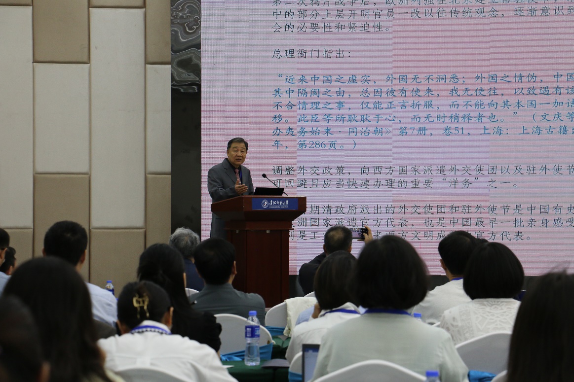 在7月13日的开幕式上,中国英汉语比较研究会前会长罗选民教授应邀做了主旨报告。其作为研讨会第一主旨发言人,发表了题为“同治朝中国外交使团‘新西洋’形象建构的跨文化解读”的演讲。其条分缕析了同治时期中国几个外交使团出使西方的所见所闻、所记所录,所感所想,勾勒出使团成员在倾慕西方文物制度的同时,又坚定地维护中国传统道德伦理的内在矛盾,概括了这种跨文化冲突的历史价值和历史意义,为跨文化研究开辟了一个新的方向,受到与会人员的一致好评。