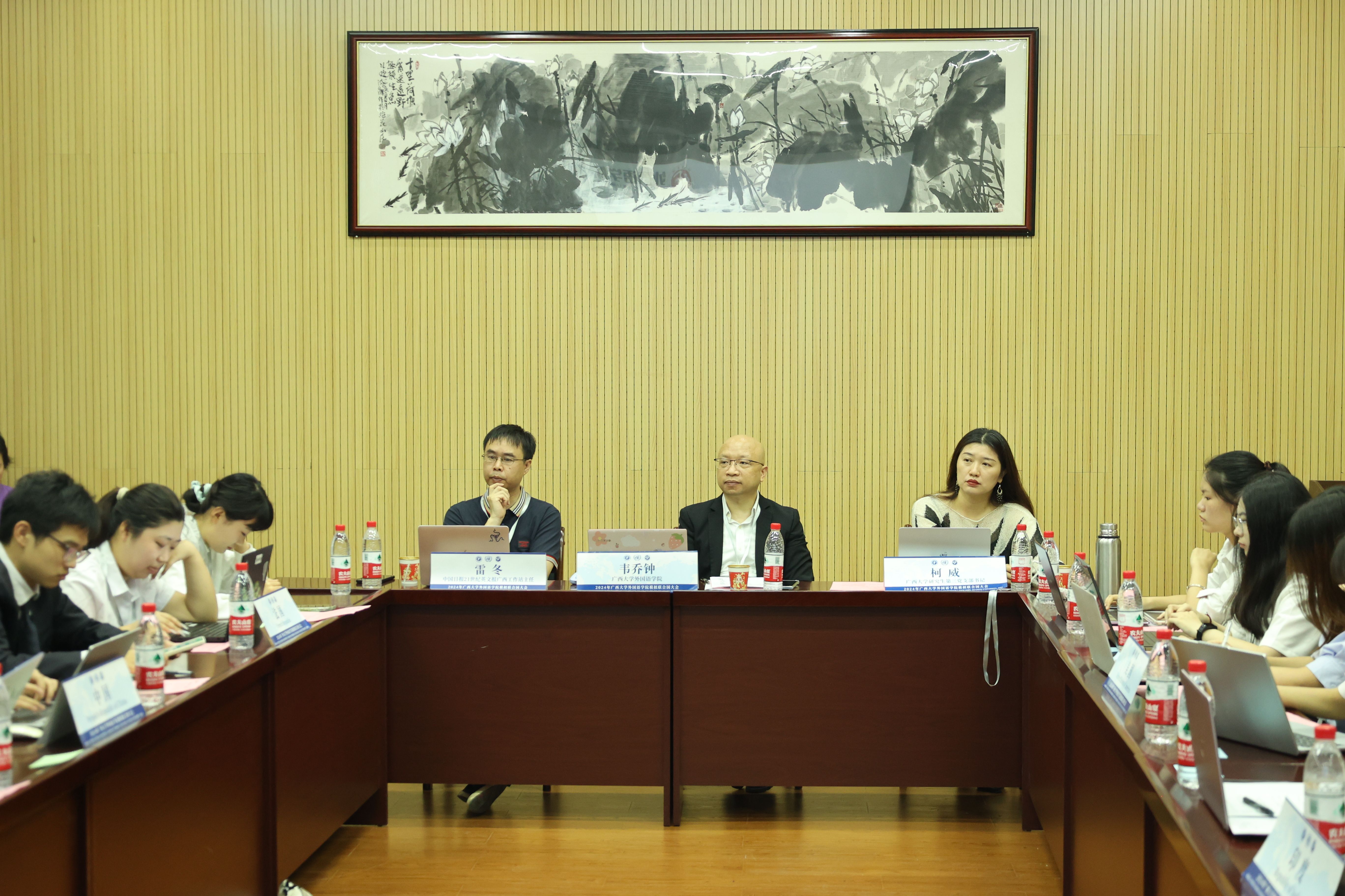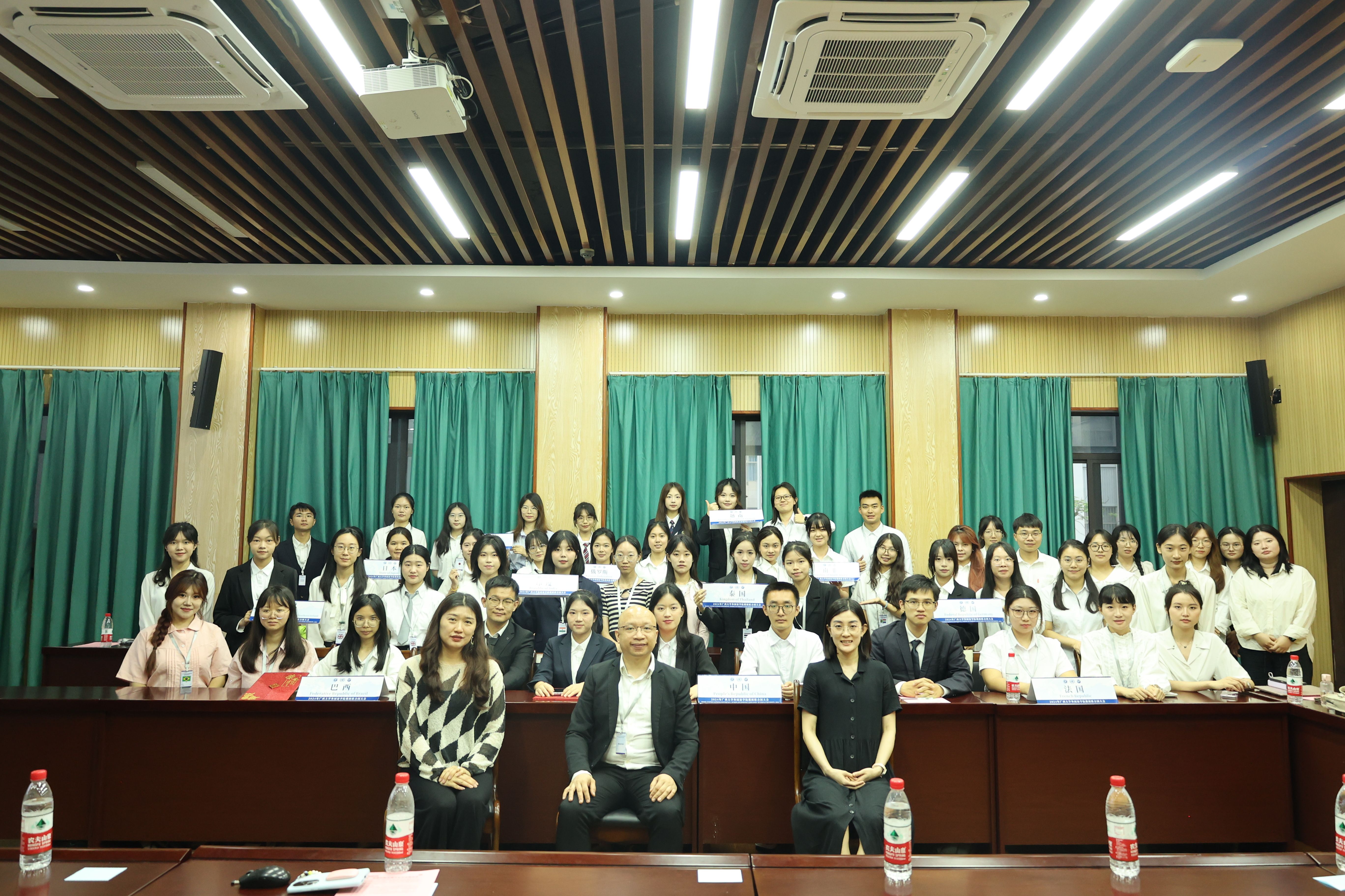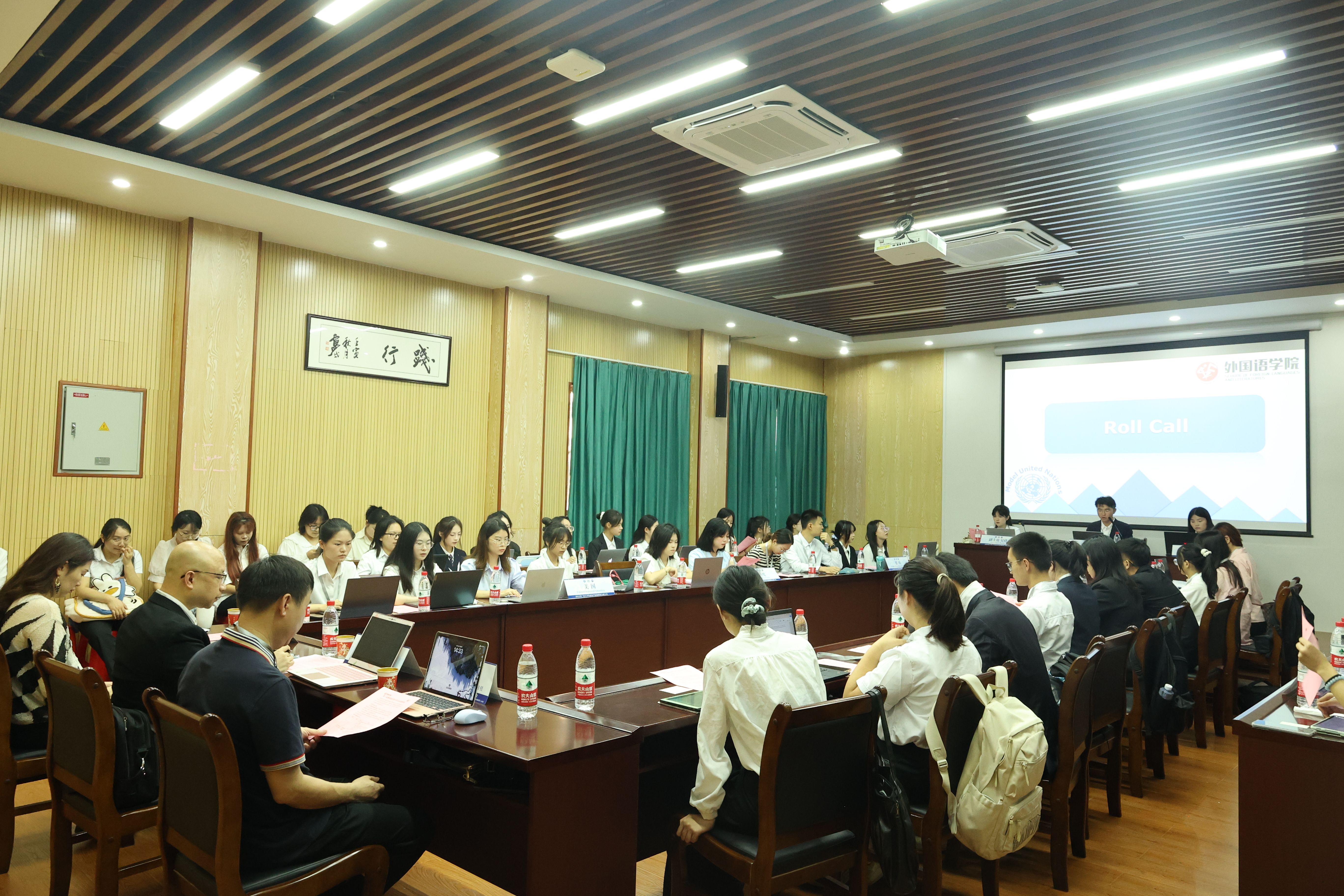 韦乔钟老师(右二)颁发最佳学术写作奖,左一为英语212班黄柯尧(德国代表团),右一为23英语笔译班李芳静(美国代表团)