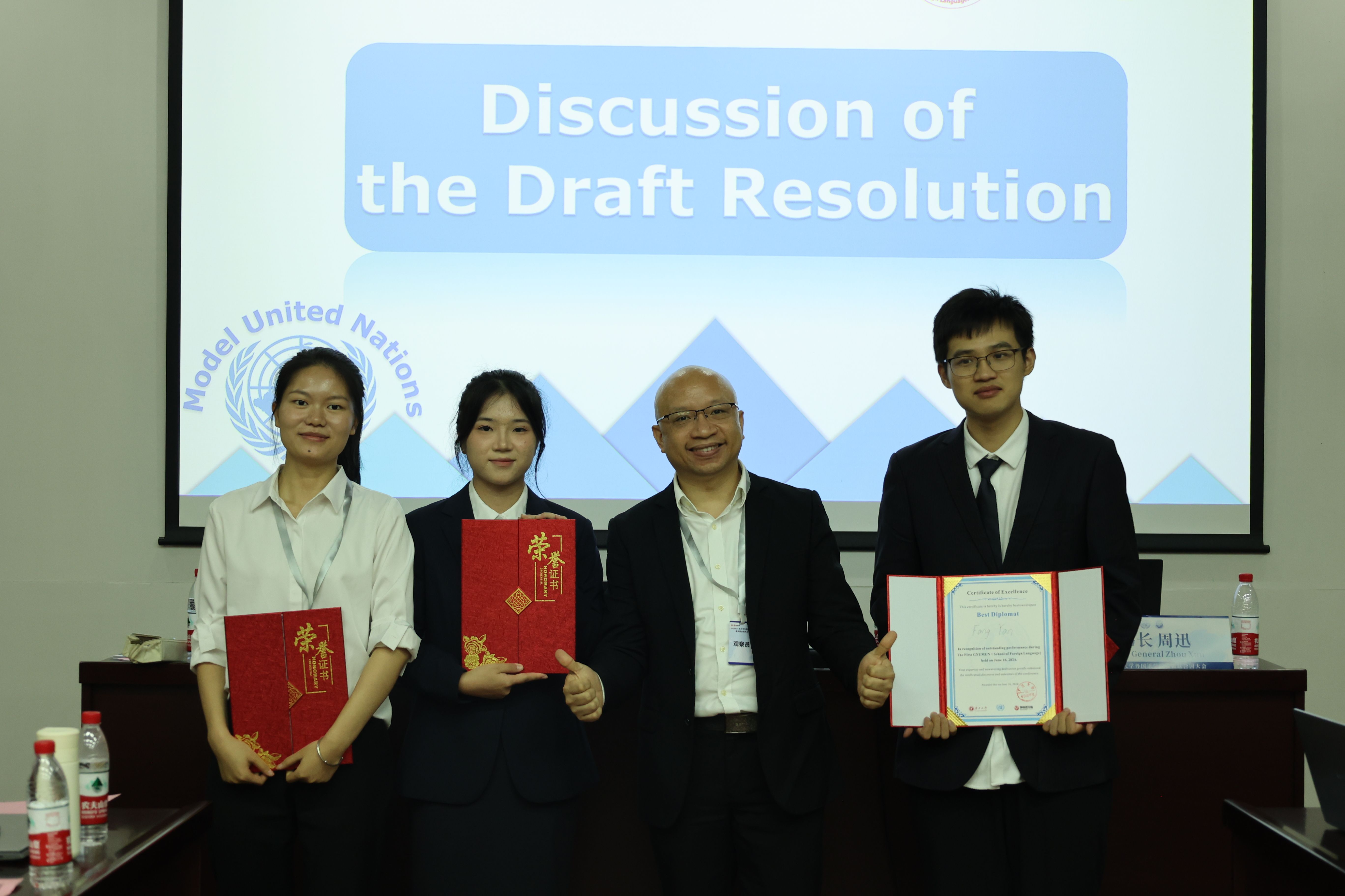 韦乔钟老师(右二)为最佳外交官颁奖,从左至右依次为:23外国语言文学班易明霞(美国代表团)、英语232班梁艺林(中国代表团)、电气工程学院方琰(法国代表团)