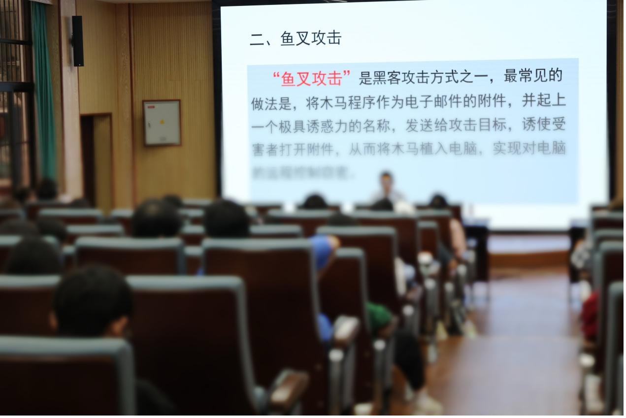 教育活动上,网络领域的专家唐老师以国家网络安全为切入点,从“认识网络空间安全”、“何为网络攻击”、“我国面临的网络安全形势”、“网络攻击手法及典型案例”、“加强网络反间谍安全防范工作”五个方面入手,详细介绍了国家网络安全的内涵与重要性,并通过讲解典型生动的案例事件和观看视频的方式,让同学们懂得了网络安全是国家安全的重要组成部分,没有网络安全就没有国家安全。同时认识到作为一个合格的中国公民应自觉履行维护国家安全的义务,把总体国家安全观落实到每个人。