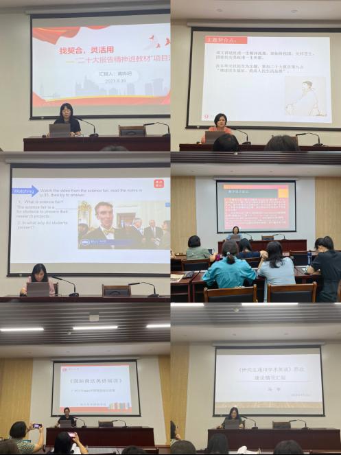 然后,黄晔明、李冰、韦丽春三位老师汇报了“党的二十大精神进教材”资源包制作小组数字资源包开发情况;任蓉、梁卿、马宇三位老师汇报了《高级英语一》《国际商法英语阅读》《研究生通用学术英语》三门校级思政示范课建设情况,这体现了大学英语系教师用行动将党的二十大精神内化于心、外化于行;坚持教育教学改革创新,使思政教育真正做到铸魂育人,启智润心。