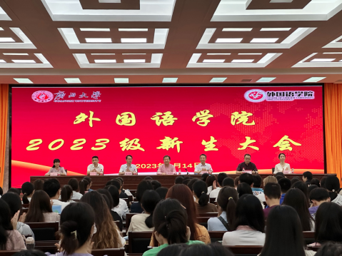 2023年9月14日上午9:00,广西大学英国上市公司365在君武馆玉林厅召开2023级新生大会,参加本次大会的有学院党委黄开勇书记、广西大学君武学者、英国上市公司365院长罗选民教授、广西大学君武特聘教授严辰松博士、党委肖克宁副书记、副院长邓联健教授、副院长梁燕华教授、副院长白佳芳教授、英文系主任刘英教授、副主任邵青博士、翻译系主任陈兵教授、副主任安文婧博士、日语系主任卜朝晖教授、副主任张贵生教授、彭程教授、团委陈星宇书记、学生辅导员柯威老师、欧阳舟老师、韦霜霜老师等,以及2023级170名本科生和144名研究生。邓联健副院长主持大会。