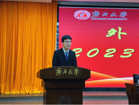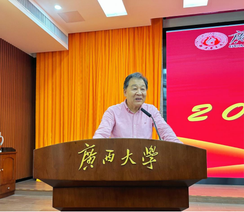 罗院长首先欢迎了从五湖四海来到广西大学求学的2023级学生,他用四个“心”结尾的短语指导新生开启大学新征程。分别是“不忘初心”、“充满爱心”、“拥有专心”、“处处用心”。他教导新生要胸怀理想,顺势而发,不畏艰难,勇往直前,不忘初心,为自己喜爱专业和研究方向衣带渐宽终不悔,努力奋斗;引导新生要爱祖国,爱人民,爱自己的专业,永远要做一个有爱心的人、高尚的人;告诫新生要专心完成学业,要修满学分,并以马蹬的案例来引导学生要目标明确、发力精准,获得更好的成绩;提醒新生要做一个处处有心的有心人,善于去发现一些被大家忽略的人和事。最后他鼓励广大新生,人生不是以长度来计算,而是以强度来衡量,人可以被打垮,但不可以被击败。希望每一位学生,刻苦学习,努力耕耘,创造出自己无怨无悔的精彩人生。