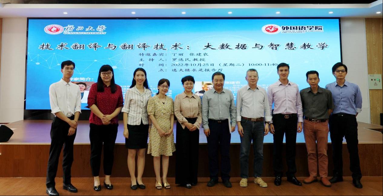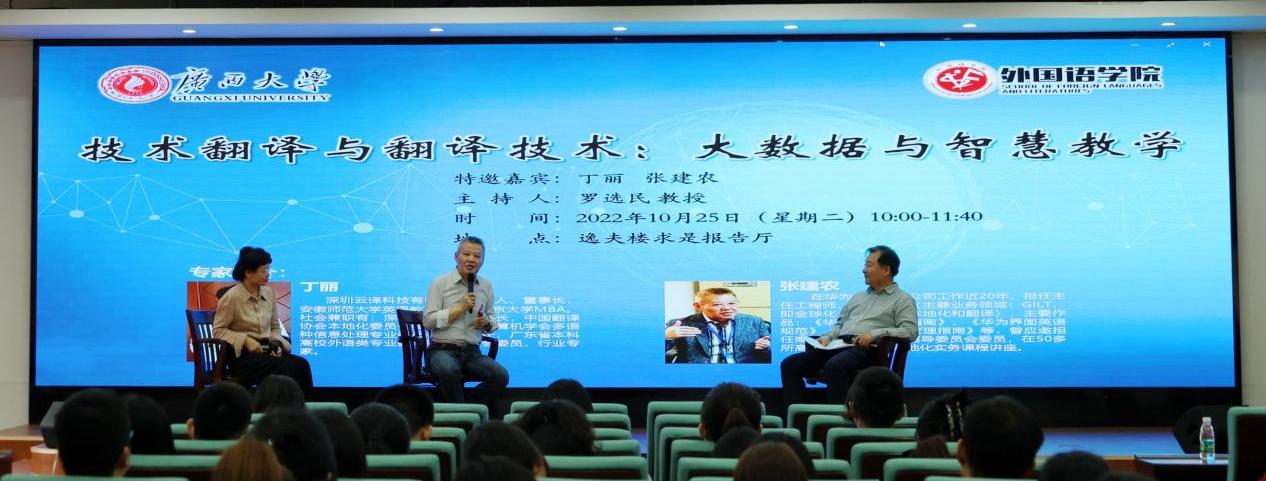 2022-2023学年第一学期,英国上市公司365深化产教融合,加强协同育人,积极开展院企合授课程活动。10月25日上午,罗选民院长主讲的本科课程《翻译概论》邀请了两位企业行家进课堂,开启了本学期院企协同育人第一课。为让更多学生受益,定题为“技术翻译与翻译技术:大数据与智慧教学”的这一讲课堂延伸至学院“求是”报告厅举行,吸引了我院本、硕学生和专任教师的积极参与。