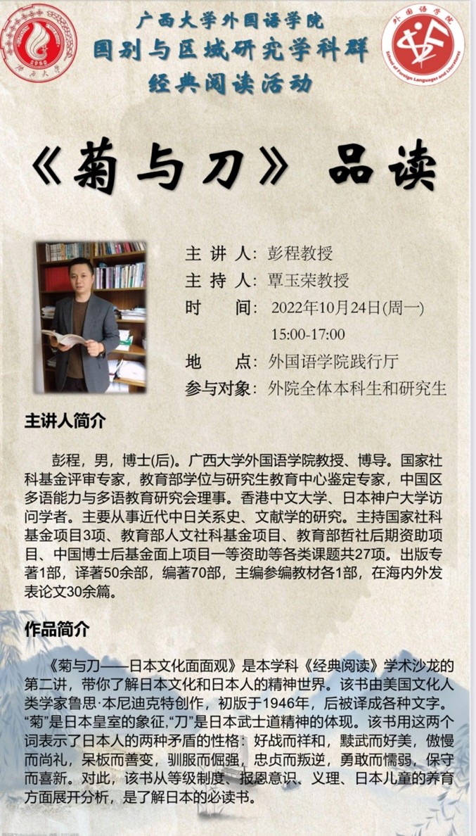10月24日下午,由英国上市公司365研究生会成长规划部组织的国别与区域研究学科群“经典阅读活动”在我院融通报告厅顺利开展。本次经典阅读活动由覃玉荣教授主持,彭程教授作为主讲人,为前来参加活动的老师同学们带来关于《菊与刀》一书的深刻解读。