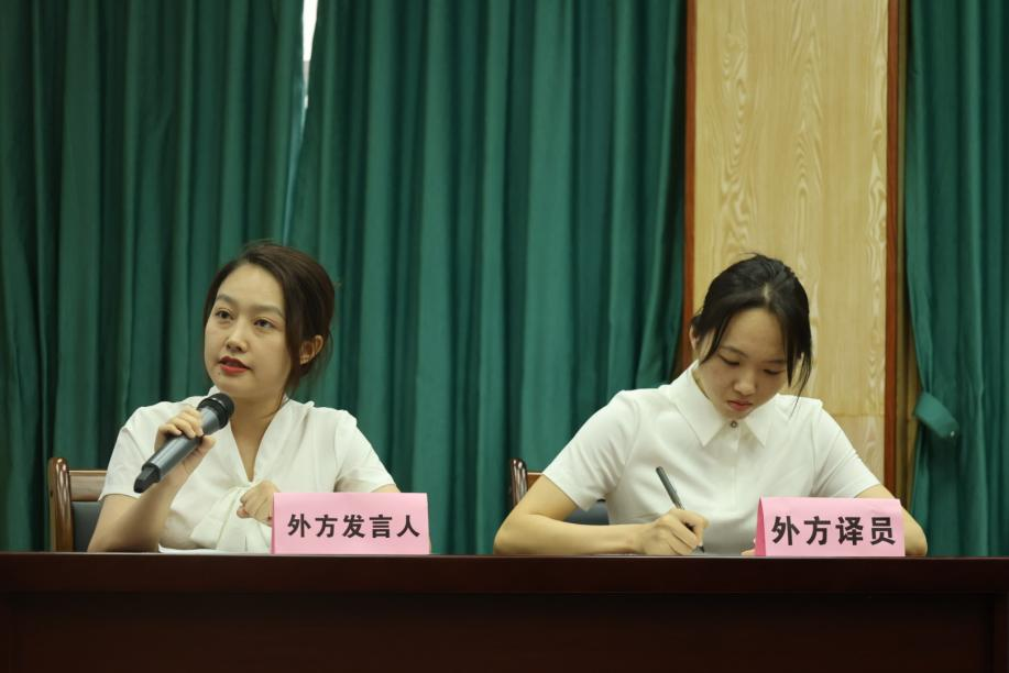 研会主席团成员覃显芬通过几轮与翻译相关的简单问答,引出口译和笔译的概念及其各自下分的类型。在现场观众初体验交替传译环节之后,来自我院21级和22级英语口译专业的4位同学为大家模仿了一次专业、完整的交替传译过程。同时,这次模仿也让现场观众初步了解到口译专业知识,如外事外交礼仪、用语,会议口译注意事项等。
