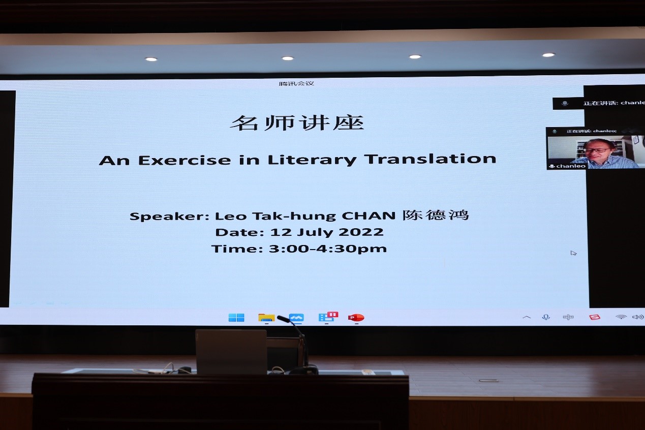 在经过短暂的休息后,第二场名师讲座由广西大学君武特聘教授、香港浸会大学陈德鸿教授开讲,主题为“An Exercise on Literary Translation”,由胡戈副教授主持。本场讲座以线上方式进行,陈德鸿教授以细致入微的文本分析,为大家带来了精彩的文学翻译实践案例解析。他指出,文学翻译领域内中译英的关键是把握时态的选择。中译英的一个关键问题是时态问题,只有把握好英语动词的时态才能翻译好文学文本。此外,陈德鸿教授提醒广大在场师生和营员注意区分英文对话与中文对话的分段,由此才能更好的把握文学作品的中译英实践。讲座的最后,陈德鸿教授鼓励大家阅读经典,提升自我的修养境界,为今后的学习与工作打下坚实的基础。