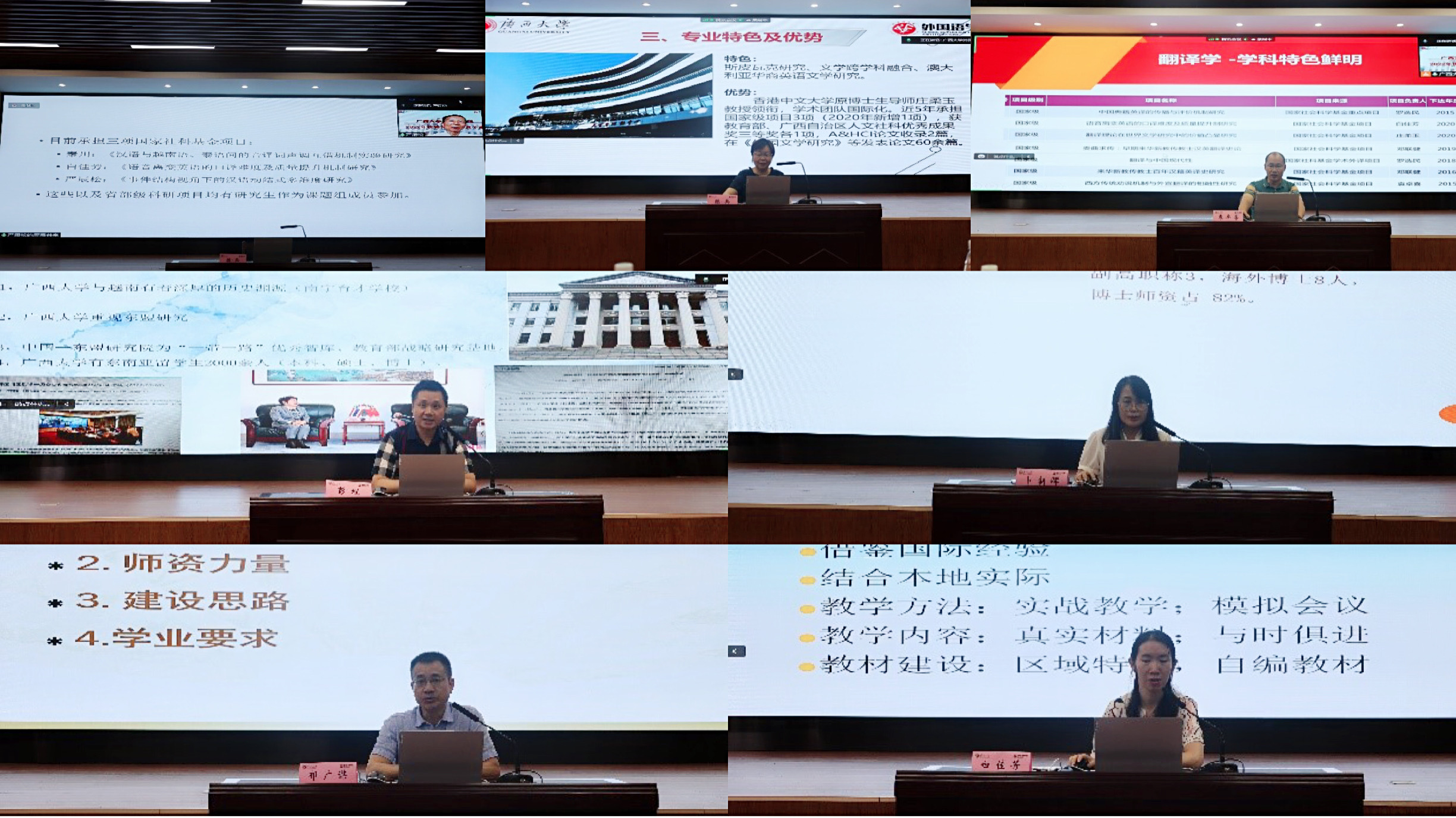 (上图为学科方向带头人作专业介绍中,从左上到右下依次为:严辰松教授、陈兵教授、袁卓喜副教授、彭程教授、卜朝晖教授、祁广谋教授、白佳芳副教授)