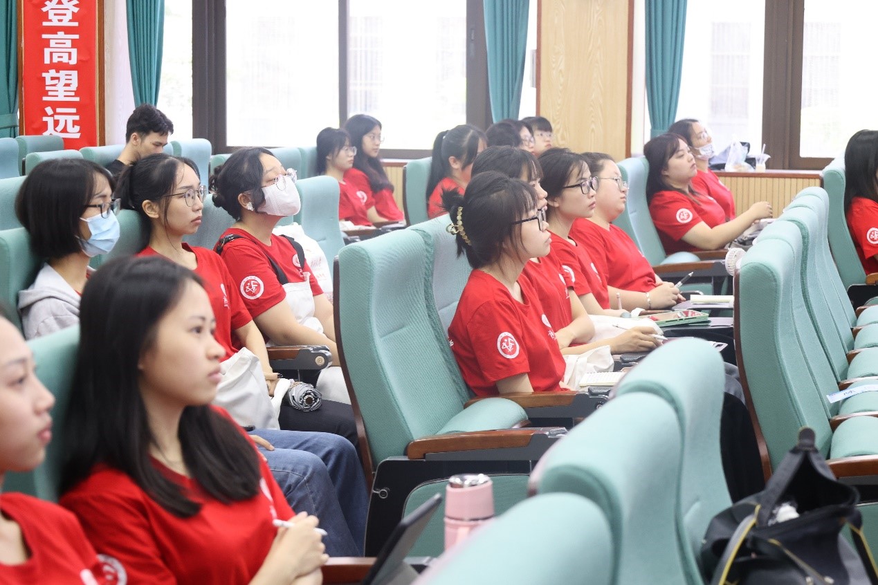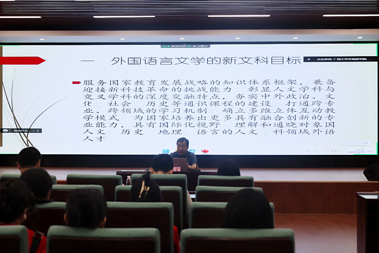在专业学科介绍环节,广西大学君武特聘教授、外国语言学及应用语言学学科带头人严辰松教授、英语语言文学学科骨干陈兵教授、翻译学学科骨干袁卓喜副教授、国别区域与研究骨干彭程教授、日语语言文学学科带头人卜朝晖教授、越南语学科带头人祁广谋教授、英语口译专业骨干白佳芳副教授分别通过云端分享和现场讲解的方式,向营员们介绍了外国语言学及应用语言学、英语语言文学、翻译学、国别和区域研究、日语语言文学等外国语言文学一级学科方向的研究基础、研究内容、研究团队和课程体系,以及英语笔译、英语口译、日语笔译和越南语笔译等翻译专业研究生的培养条件、培养环境和培养成效等,全面系统地展示了各学科方向的师资力量和培养目标。在发言结束之际,教授们纷纷表示热烈欢迎同学们报读广西大学,到外语学院实现自己的人生理想。 在随后的提问环节中,针对线上线下营员们的问题,各位学科带头人同样给出了精彩的解答。