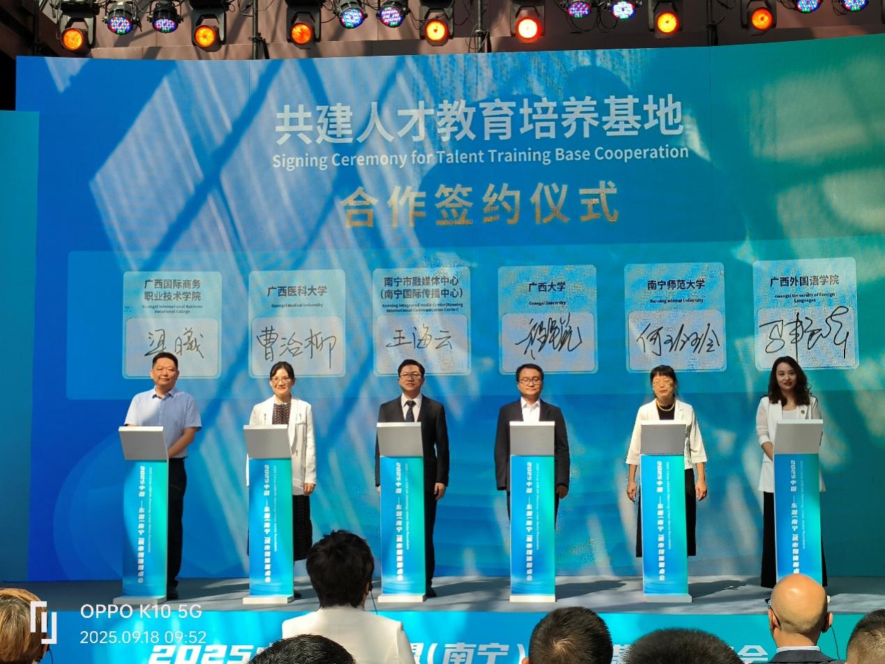 会上,南宁市融媒体中心(南宁国际传播中心)与广西大学、广西医科大学、南宁师范大学、广西国际商务职业技术学院、广西英国上市公司3655所高校签署了人才培养基地共建协议,旨在推动产学研深度融合,为中国—东盟传媒合作储备青年力量。我院党委副书记、纪委书记程锐代表广西大学出席签约仪式,并与南宁市融媒体中心(南宁国际传播中心)签订共建人才教育培养基地合作协议,双方致力于共同打造校企合作共建人才教育培养基地。