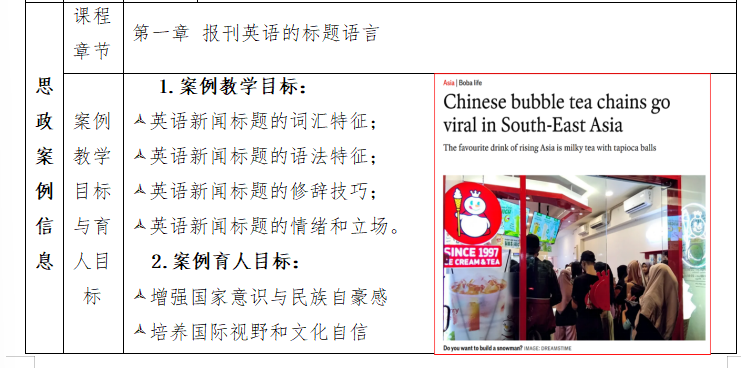 《〈中国奶茶“蜜雪冰城”连锁店在东南亚的扩张〉教学案例》以鲜明的时代特色和创新视角,将外语专业知识、国际传播能力培养与课程思政深度融合。案例以中国品牌“蜜雪冰城”走向东南亚市场为切入点,分析其跨国经营与文化传播路径,引导学生理解中国企业“走出去”的时代意义。课堂中自然融入“文化自信”“中国形象传播”“一带一路”等思政元素,提升学生语言与跨文化能力,深化对中国企业精神和国家战略的认识,体现课程思政“知识、能力、价值”融合的核心理念。