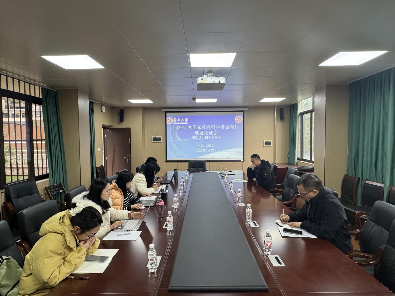 2026年1月21日下午,我院在301会议室举办翻译学方向2026年度国家社会科学基金项目选题论证会。此次论证会由邓联健教授担任指导专家,彭程教授主持。白佳芳教授、安文婧副教授、吴虹副教授、李晓滢副教授、郑慢博士、李婕博士依次进行了选题汇报。