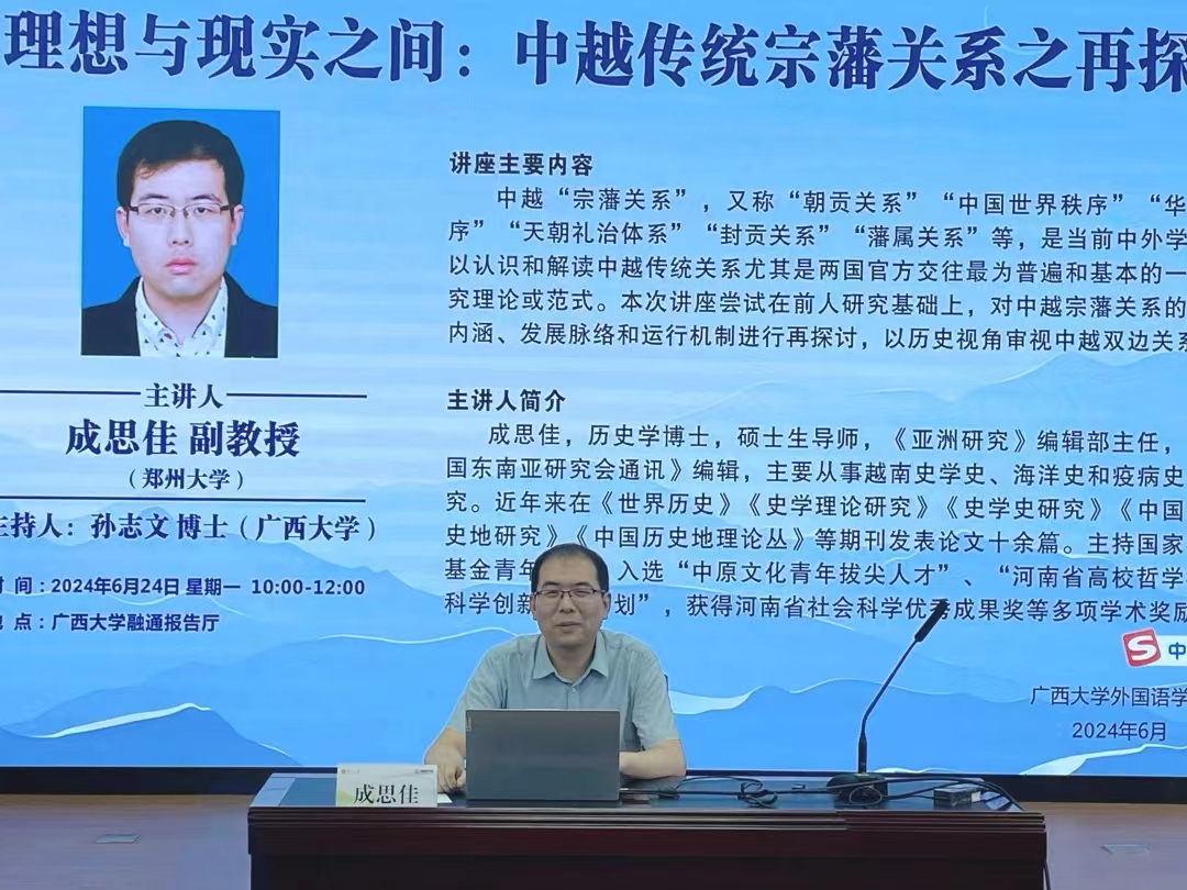 6月24日上午,英国上市公司365介子学术论坛第七十八讲在我院融通报告厅顺利举行。郑州大学副教授成思佳作了题为“理想与现实之间:中越传统宗藩关系之再探讨”的学术讲座,讲座由广西大学英国上市公司365孙志文老师主持。