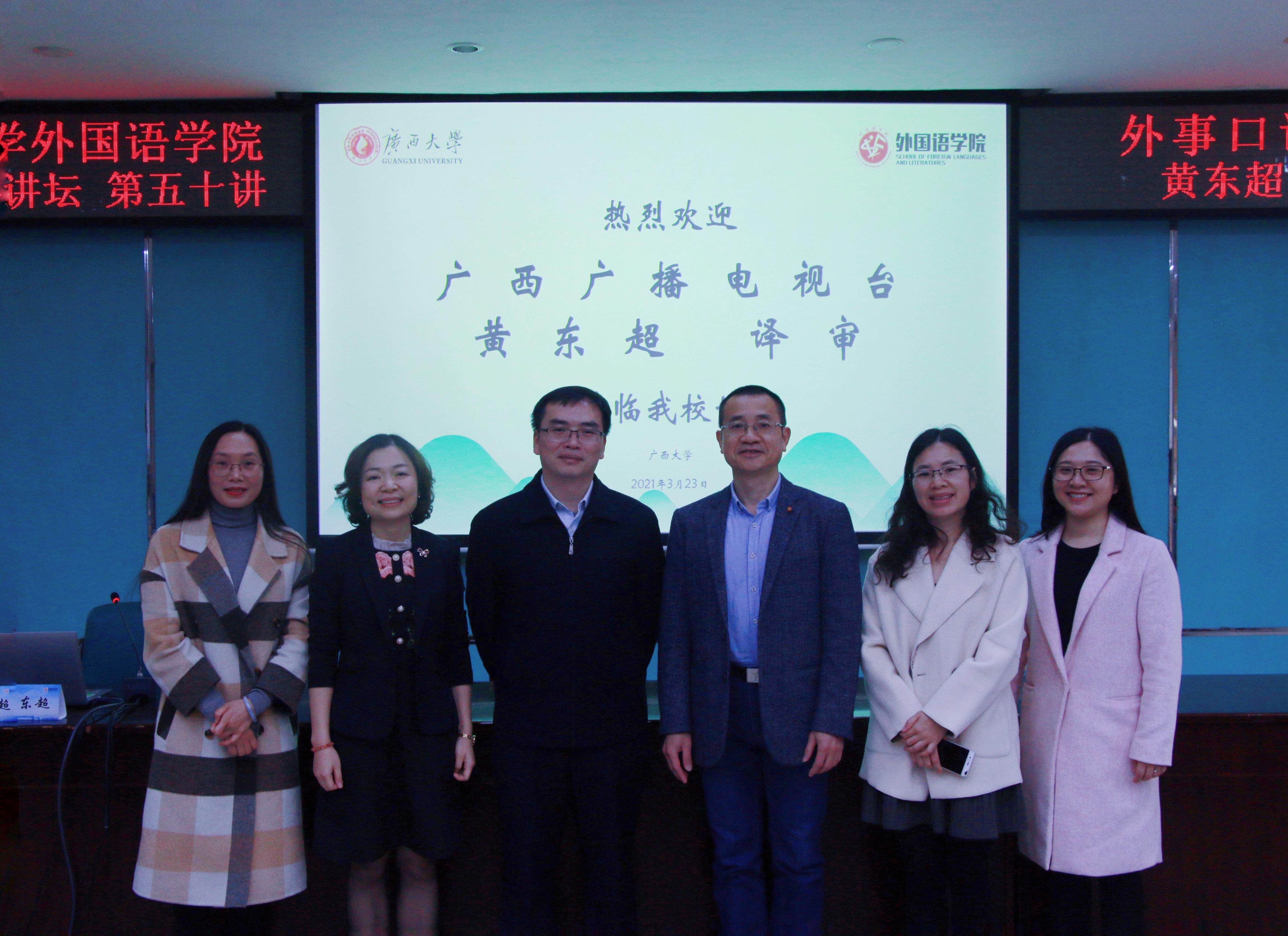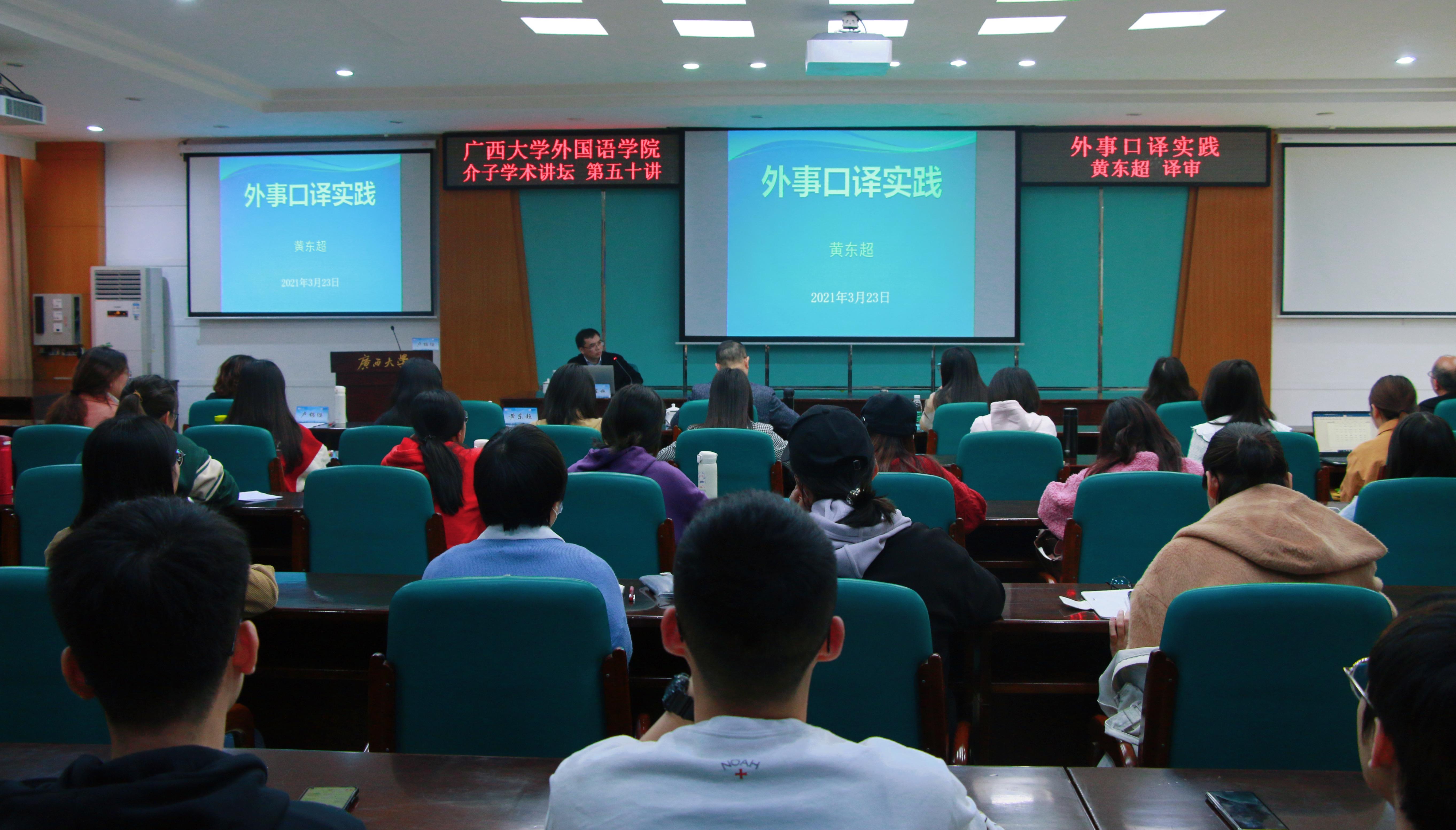 3月23日下午,英国上市公司365介子学术论坛第五十讲在广西大学君武馆第二会议室成功举办。广西广播电视台北部湾之声监制、译审黄东超老师莅临我校,为我院越南语专业师生带来了题为《外事口译实践》的精彩讲座,讲座由我院东南亚语系副主任卢锦缨老师主持。