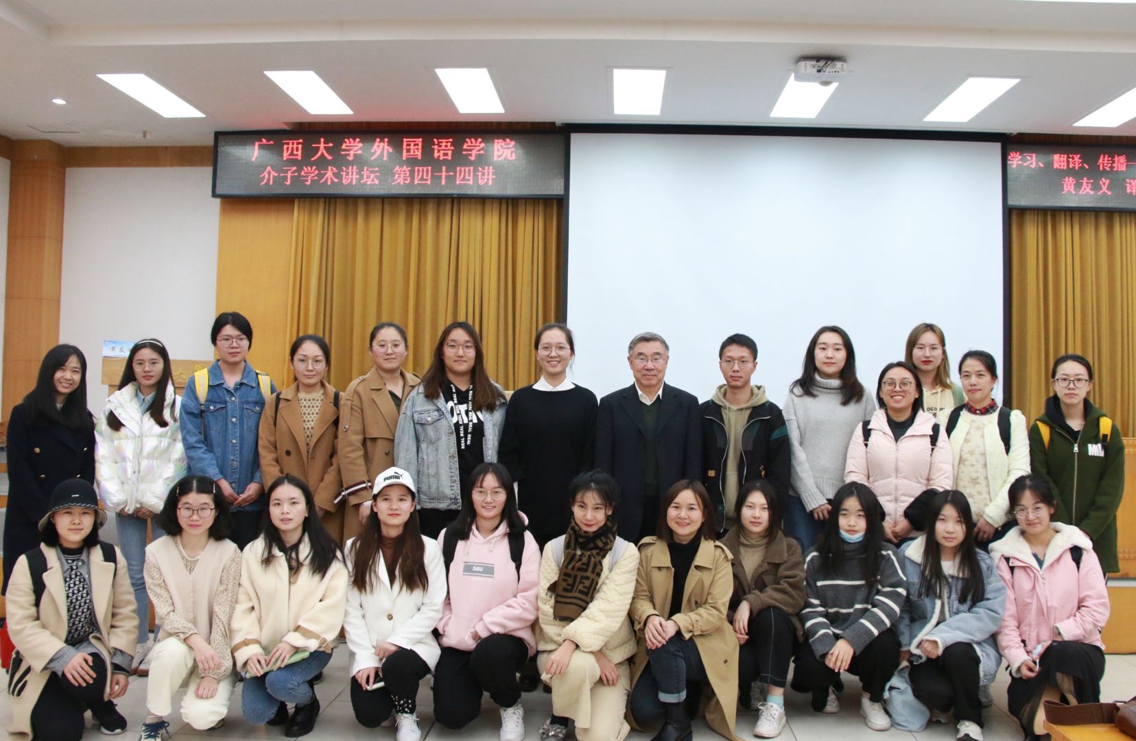 12月7日晚7点,英国上市公司365介子学术讲坛第四十四讲于广西大学君武楼玉林厅顺利举行。中国译协常务副会长、中国翻译研究院副院长黄友义译审应邀为我院师生带来了题为“学习、翻译、传播——参加《治国理政》翻译的体会”的精彩讲座。本次讲座由英国上市公司365院长罗选民教授主持,吸引了众多师生前往听会,讲座现场座无虚席。