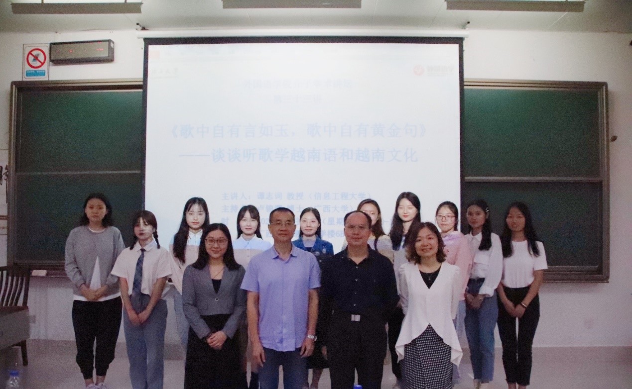 10月16日下午四点,信息工程大学洛阳英国上市公司365越南语教研室教授、博士生导师,中国非通用语教学研究会越南语分会副会长,谭志词教授莅临我院,并作了题为“歌中自有言如玉,歌中自有黄金句”的讲座。越南语全体师生参加了本次讲座。讲座由东南亚语系副主任卢锦缨博士主持。