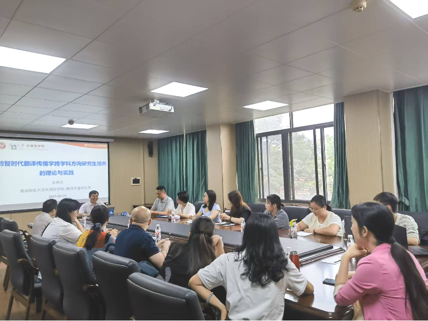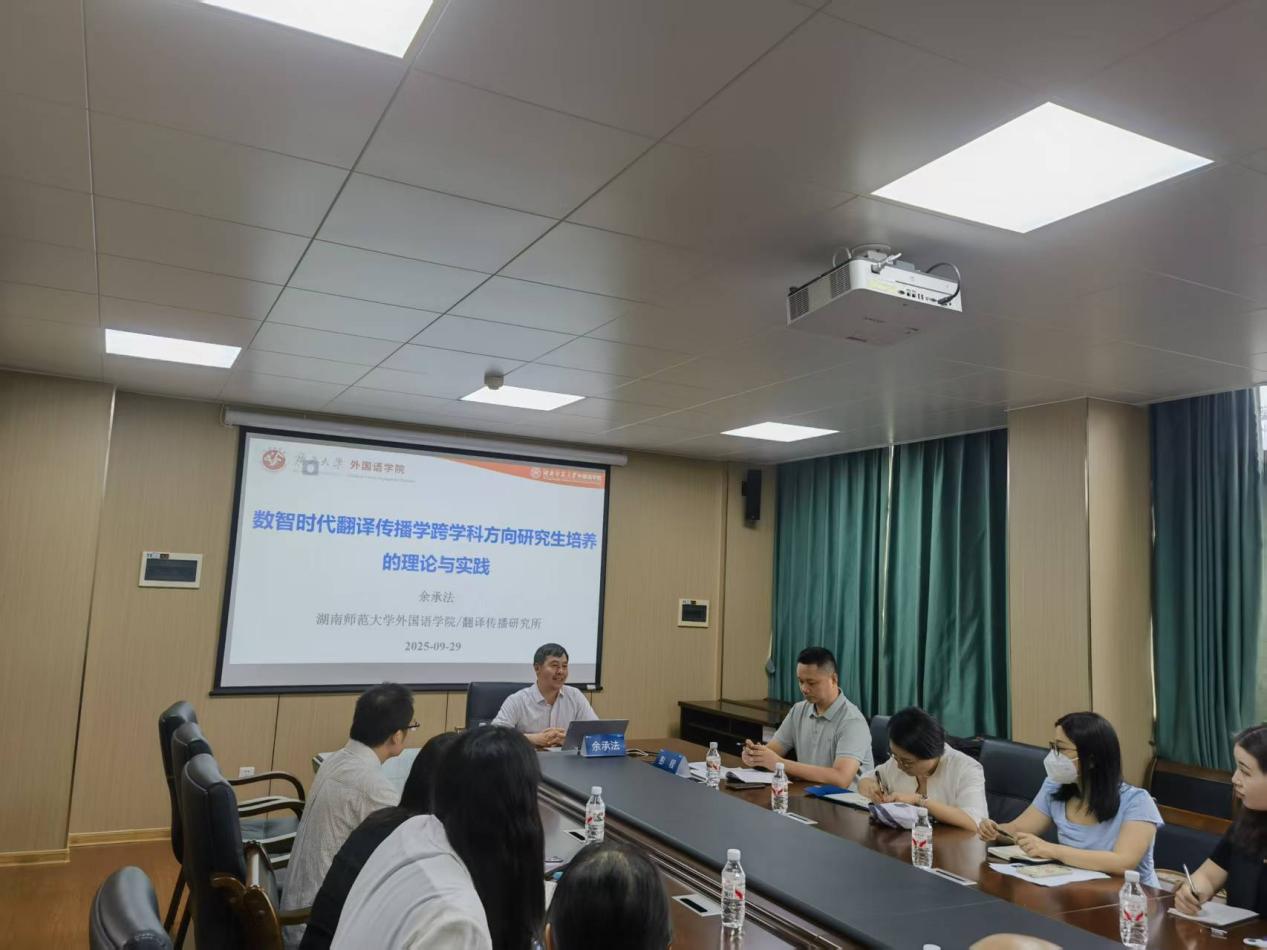 2025年9月29日下午,介子学术讲坛第一百零一讲在英国上市公司365301会议室举行。湖南师范大学余承法教授应邀做题为“数智时代翻译传播学跨学科方向研究生培养的理论与实践” 的学术讲座。彭程教授主持。