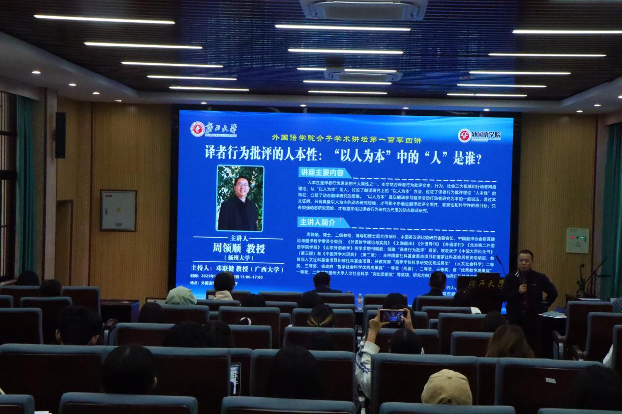 12月4日下午,介子学术讲坛第一百零四讲在学院融通报告厅举行。扬州大学周领顺教授应邀做题为“译者行为批评的人本性:‘以人为本’中的‘人’是谁?”的学术讲座。学院院长邓联健教授主持讲座。