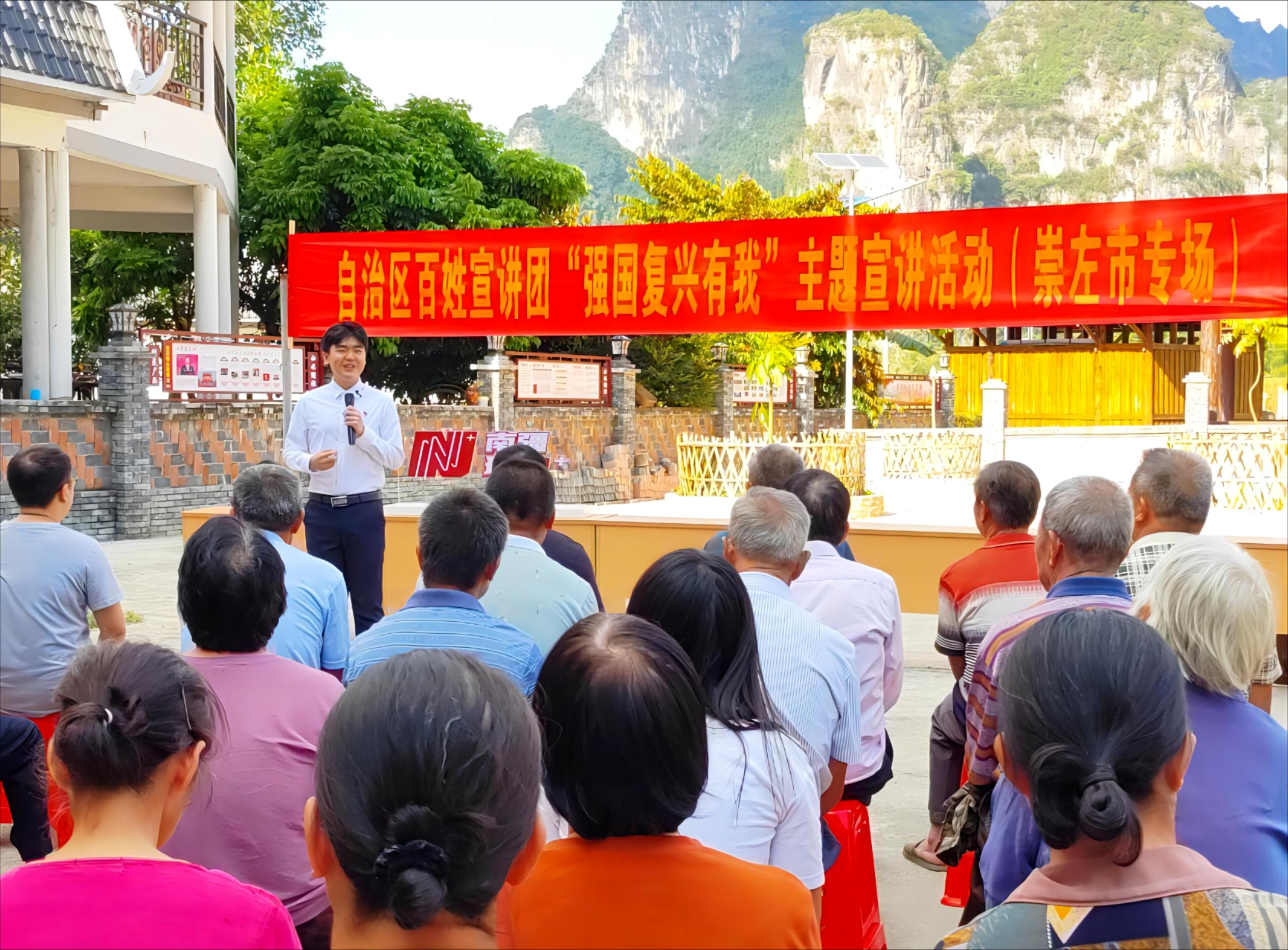 10月30日至31日,我院22级外国语言文学专业研究生、研究生第三党支部党员周洋舟同学作为广西壮族自治区党委宣传部、自治区党委讲师团遴选组建的自治区“强国复兴有我”百姓宣讲团成员,前往崇左市大新县堪圩乡明仕村以及龙州县彬桥乡安民村开展宣讲活动。