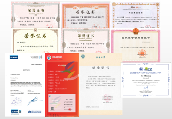 硕士期间,何霜曾获国家奖学金、一等学业奖学金、春雨奖学金等奖项与优秀共产党员等称号;曾6次参加国际国内学术会议并宣读论文;2020年作为John Benjamins“翻译学研究参考书目”项目编辑助理参与文献整理工作;2021年参加北京大学“人类命运共同体下的东方文学”暑期课程。何霜多次参与或主持多项科研项目,例如2020年省部级项目《文化记忆理论下对外翻译的“玉”文化形象构建研究》(YCSW2020044);2018年校级项目(广西大学)“大学生创新创业训练计划”《科学小实验英语训练营》(201710593111);2021年省部级项目《中美主流报刊对新冠疫情背景下的中国国家形象建构对比》(YCSW2021017),近五年在中外刊物共发表论文6篇。以下为采访内容。