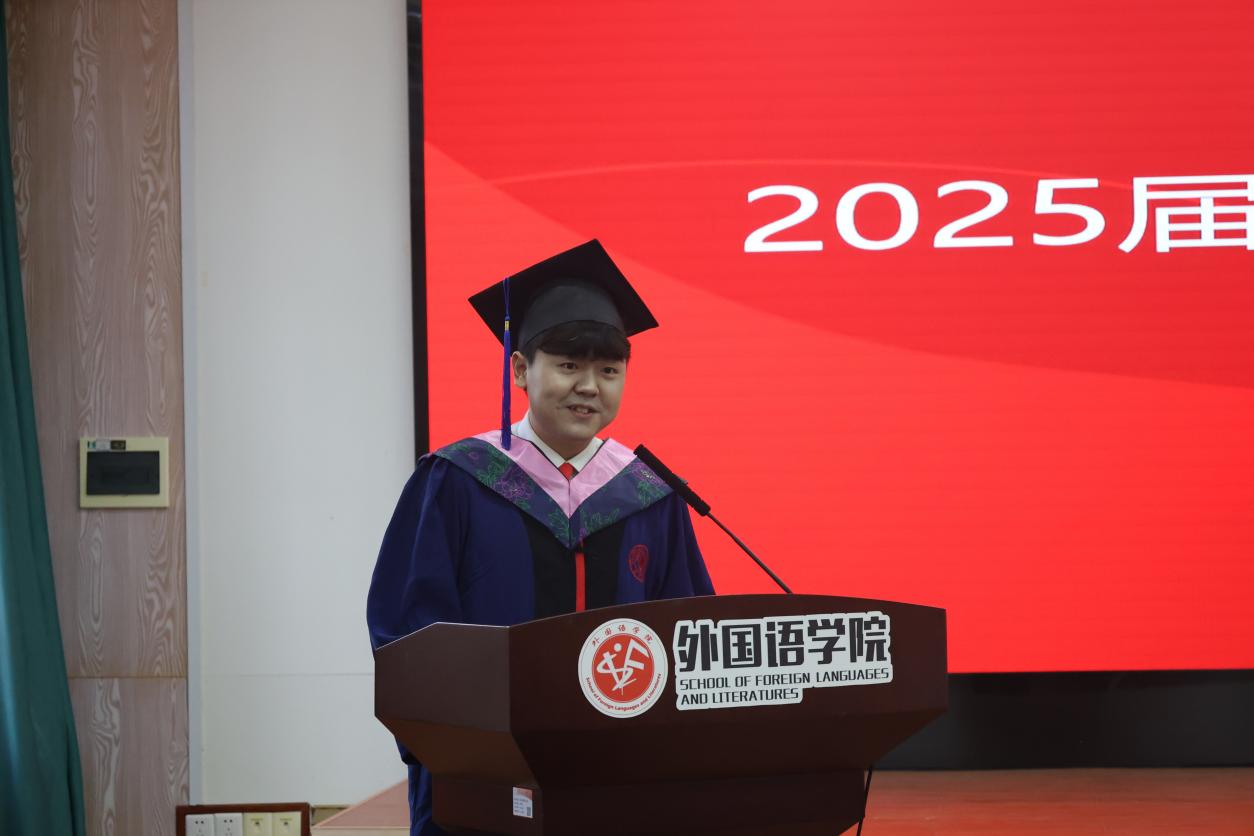 毕业生代表许金献和周洋舟上台发言,回望求学生涯、展望美好未来、分享毕业感言,并向学院、老师、家长及同学们致以最崇高的敬意和最诚挚的感谢。