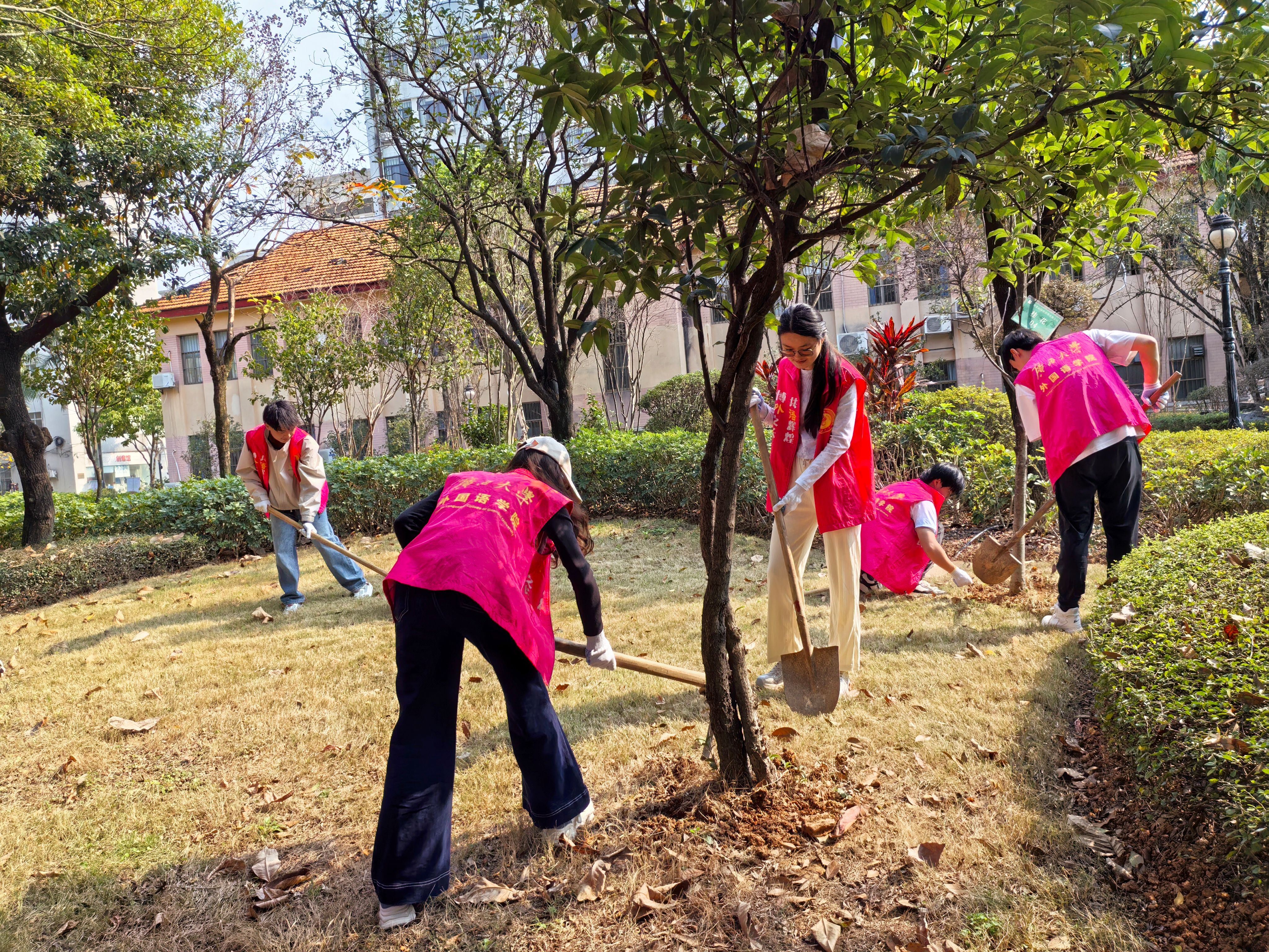 3月16日下午,日语专业本科生党支部在学院前后绿地内开展“守护绿色希望,共筑生态校园”主题党日活动,对树木进行松土、除草、施肥等养护工作,并清理了绿地内的落叶和杂物,为校园绿化环境的提升贡献力量。