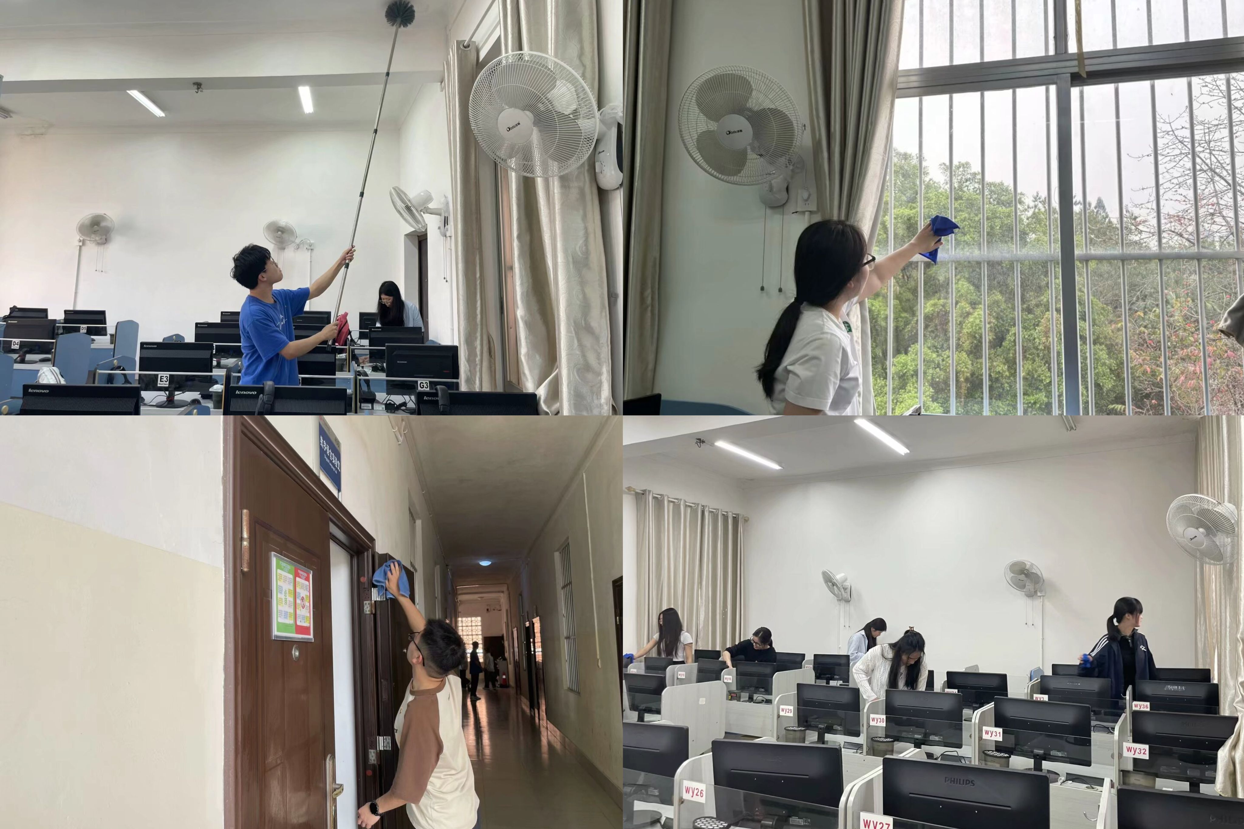 3月25日下午,英语专业本科生党支部在东11教学楼四楼语言科学实验室开展"践行劳动教育,共建美丽校园"主题党日活动。大家手持扫帚、抹布等工具,细致清理地面纸屑、粉尘,重点擦拭门窗玻璃及讲台、课桌电脑后卫生死角。经过一小时劳动,实验教室窗明几净的教学环境焕然一新。支部党员在劳动中深化了"全心全意为人民服务"的宗旨意识,用实际行动为师生营造整洁舒适的学习环境。