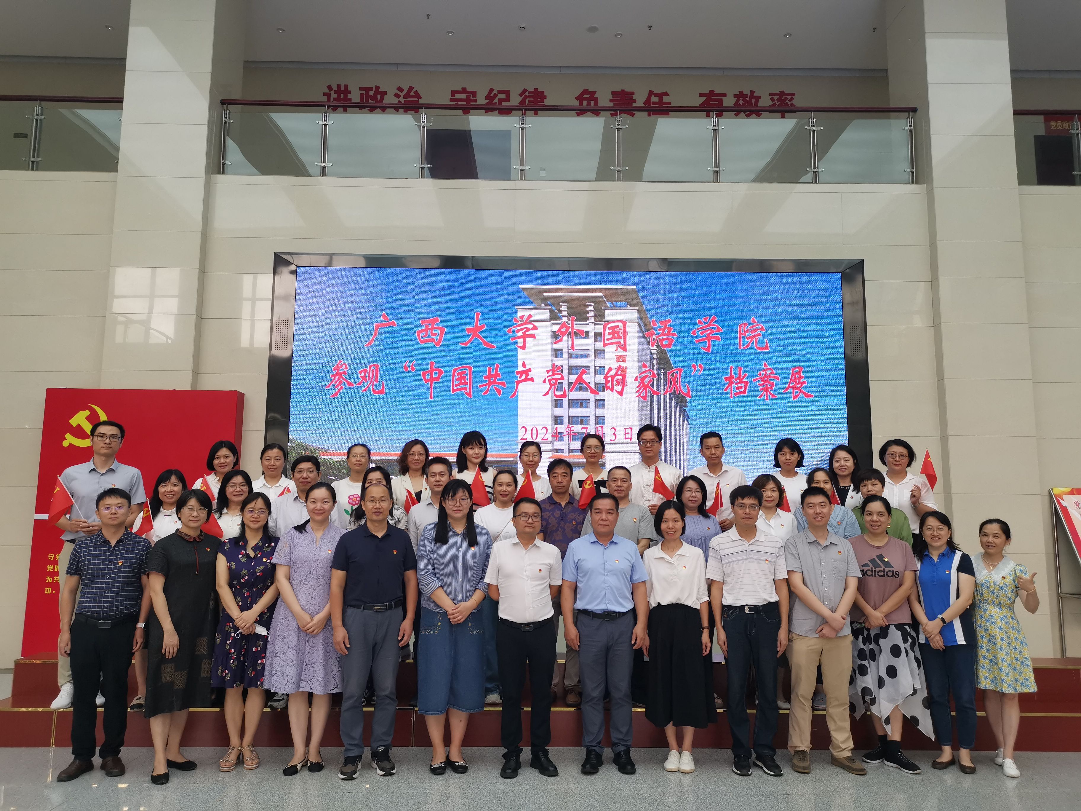 为扎实推进党纪学习教育,筑牢学院教师党员廉洁自律和拒腐防变思想防线,7月3日,我院党委书记莫柏林带领全体教职工党员,到自治区档案馆参观“中国共产党人的家风”档案展和红色广西——革命历史档案史料展。