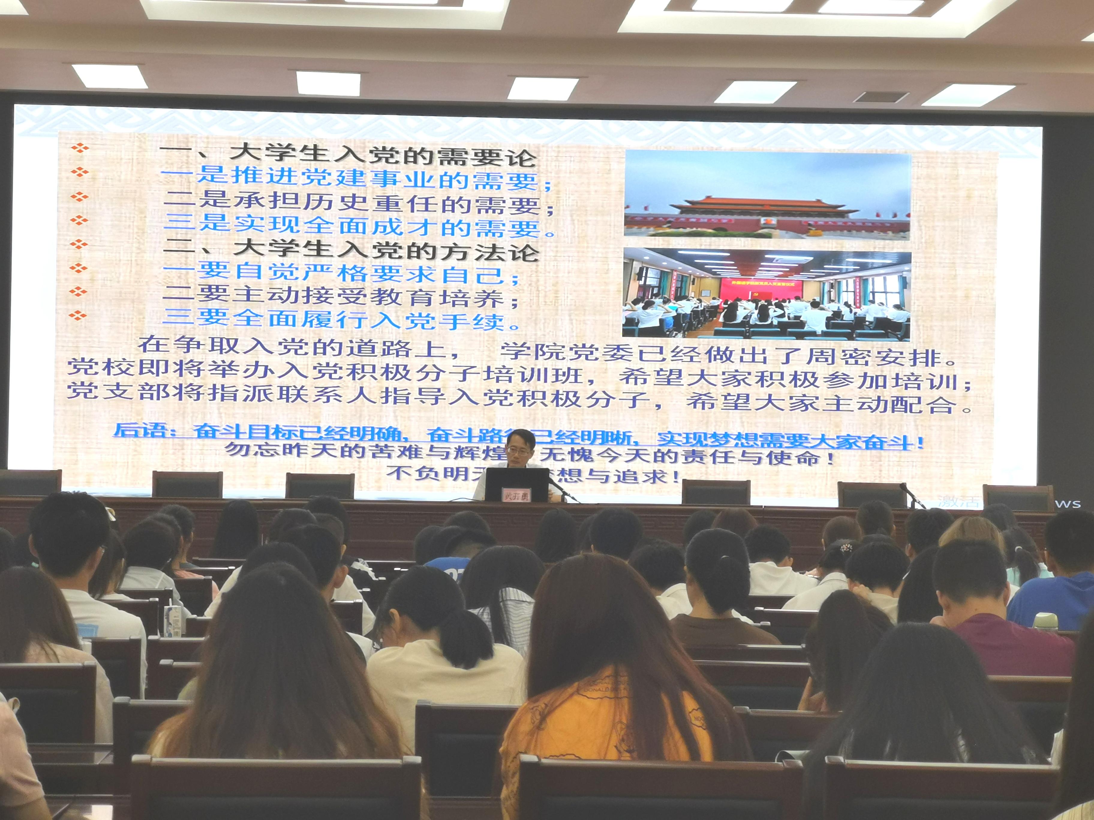 黄开勇书记从大学生入党的历史观、大学生入党的需要论、大学生入党的方法论三个方面做了详细说明。他指出,大学生入党是推进党建事业的需要,是承担历史重任的需要,是实现全面成才的需要。大学生要以优秀党员为学习榜样,自觉严格要求自己,主动接受教育培养,全面履行入党手续,积极创造条件争取早日入党,争做德智体美劳全面发展的社会主义建设者和接班人,为中国人民谋幸福、为中华民族谋复兴。