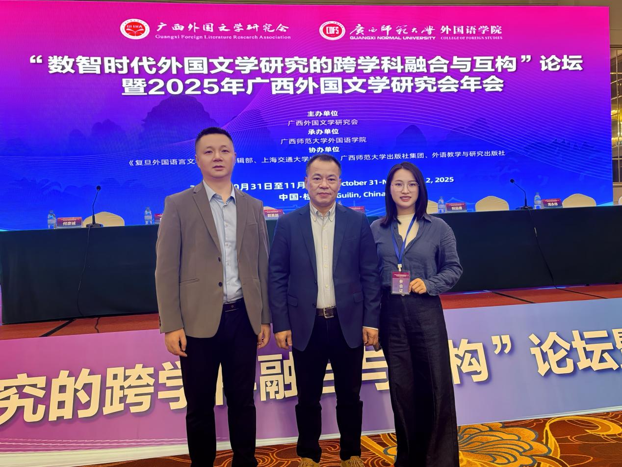 10月31日—11月2日,“数智时代外国文学研究的跨学科融合与互构”论坛暨2025年广西外国文学研究会年会成功在广西桂林市举办,吸引了全国各地高校近150位专家学者参会。基地主任邓联健教授、执行主任彭程教授与基地秘书陈瑶博士应邀参会,在学术研讨中展现出扎实的科研功底与创新活力,多项学术成果引发学界关注。