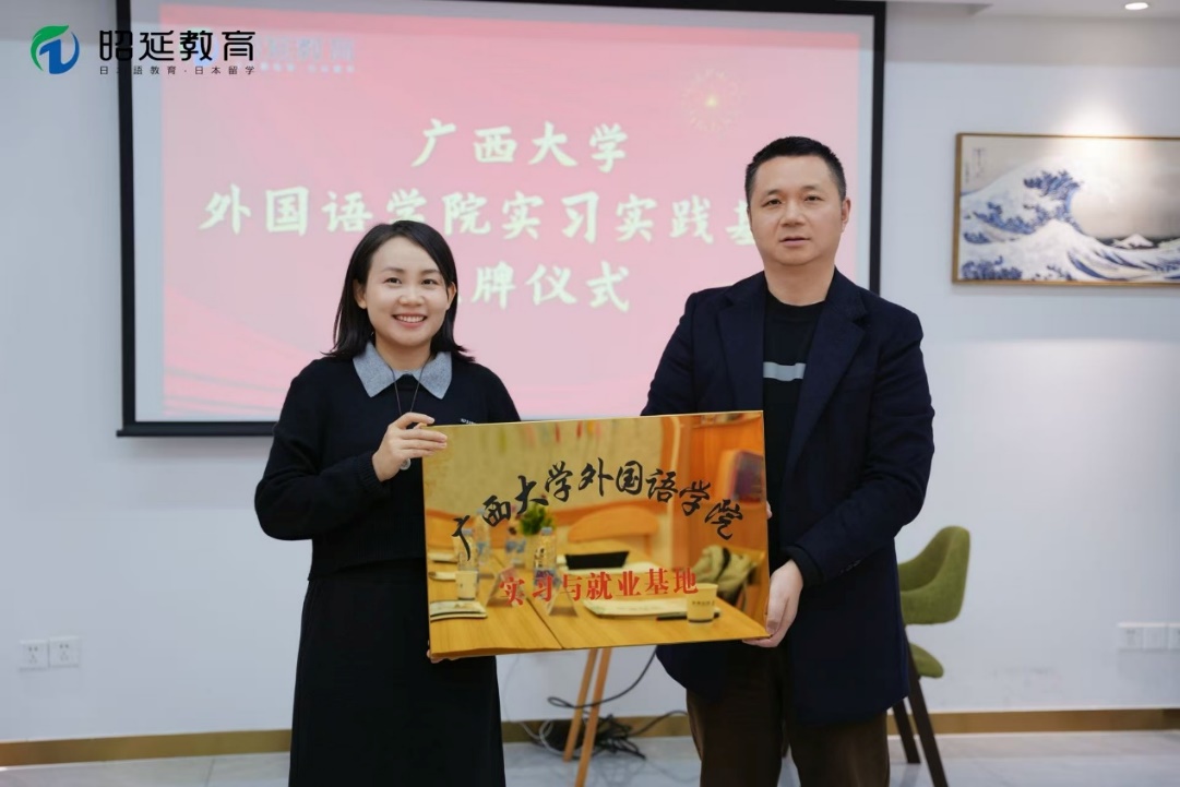 2025年12月24日下午,亚太(东南亚)翻译与跨文化传播基地执行主任彭程教授、成员黄成湘副教授、秘书陈瑶博士一行,专程前往广西昭延国际教育咨询有限公司,举行实习与就业基地挂牌仪式。这场跨越十余年的校友情谊与校企责任的双向奔赴,为西大日语专业人才培养注入了全新活力!